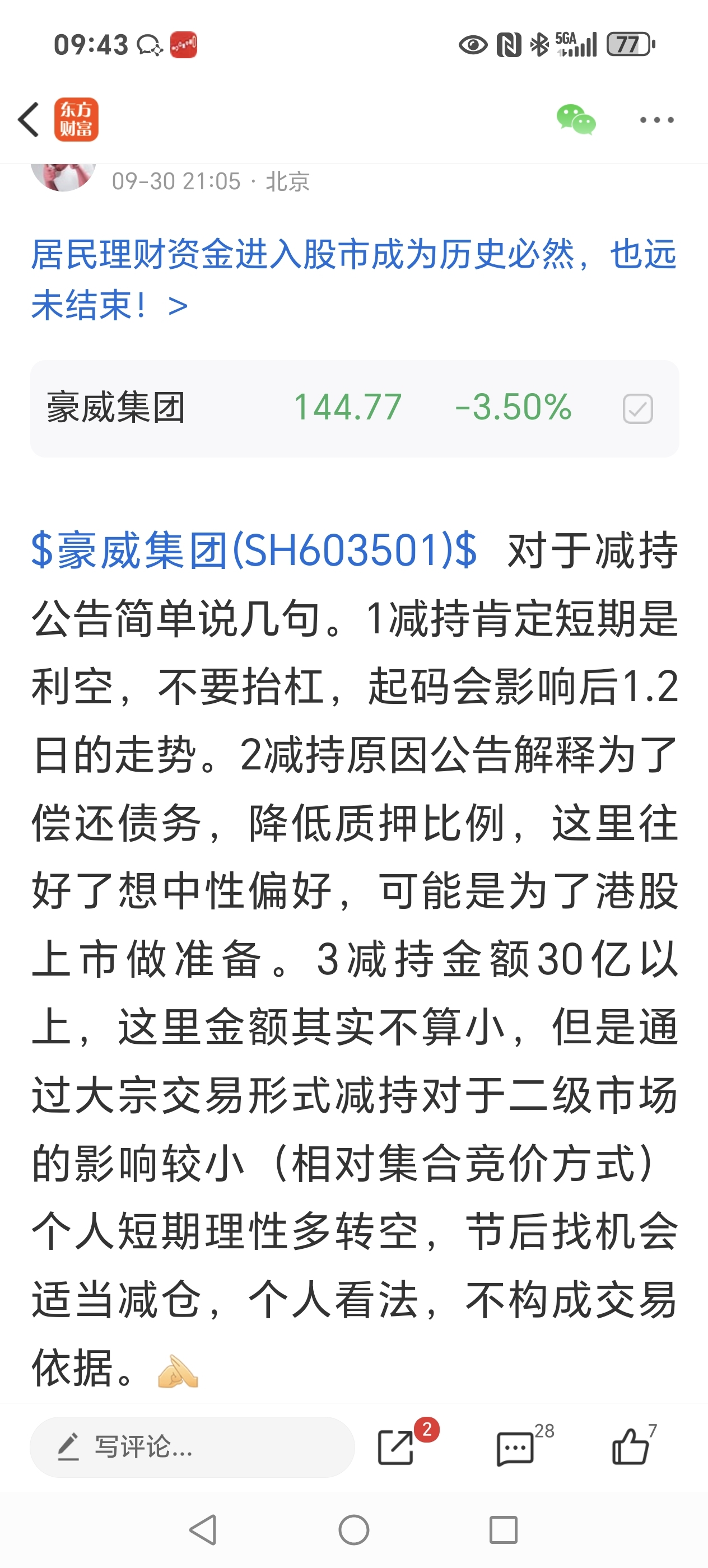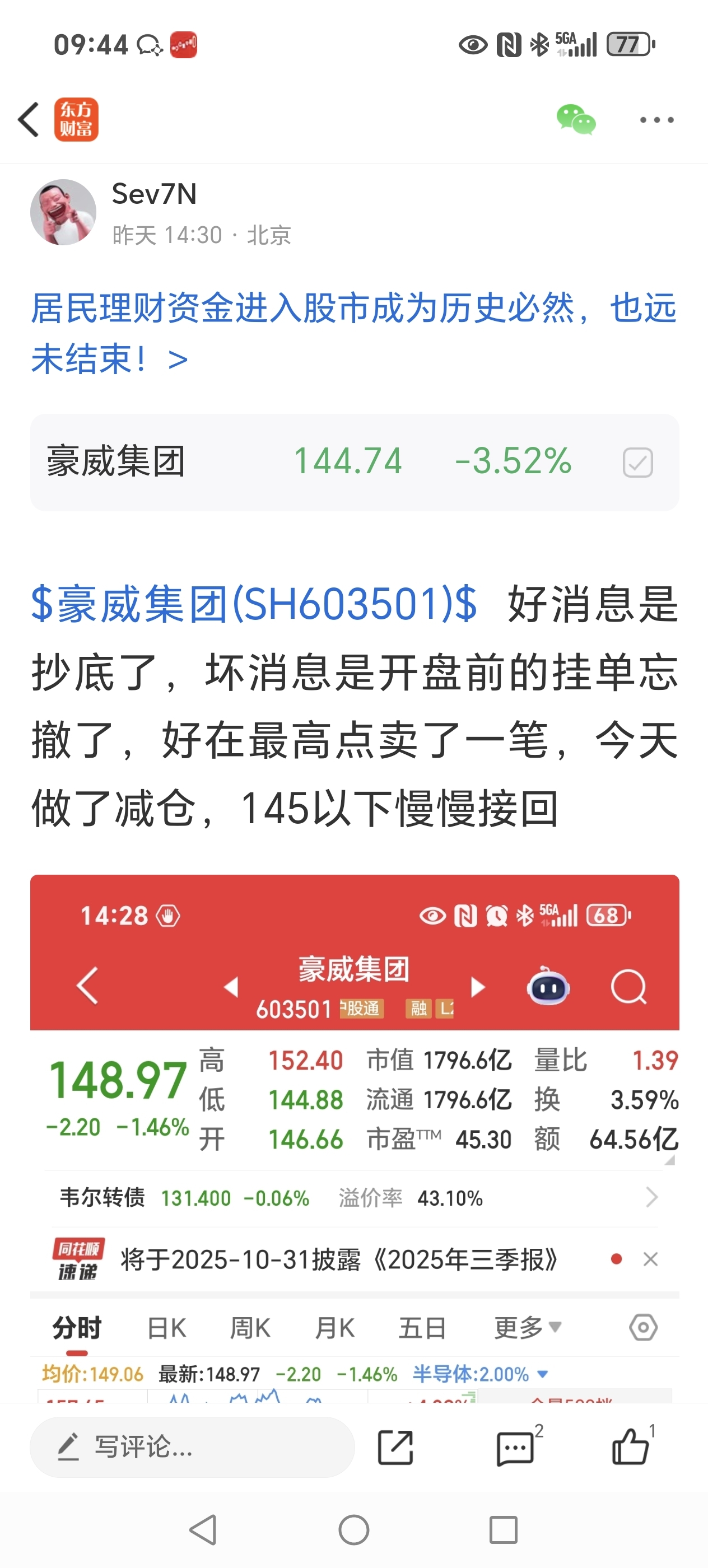 $豪威集团(SH603501)$ 吧里有个叫什么大将军的把我拉黑了,那个人属于无脑唱多引诱散户,节前我就发帖说了节后有合适位置要先减仓,等待挖坑再入,昨天均价149.5减仓,计划145以下补仓回来,开盘砸得有点狠再看看