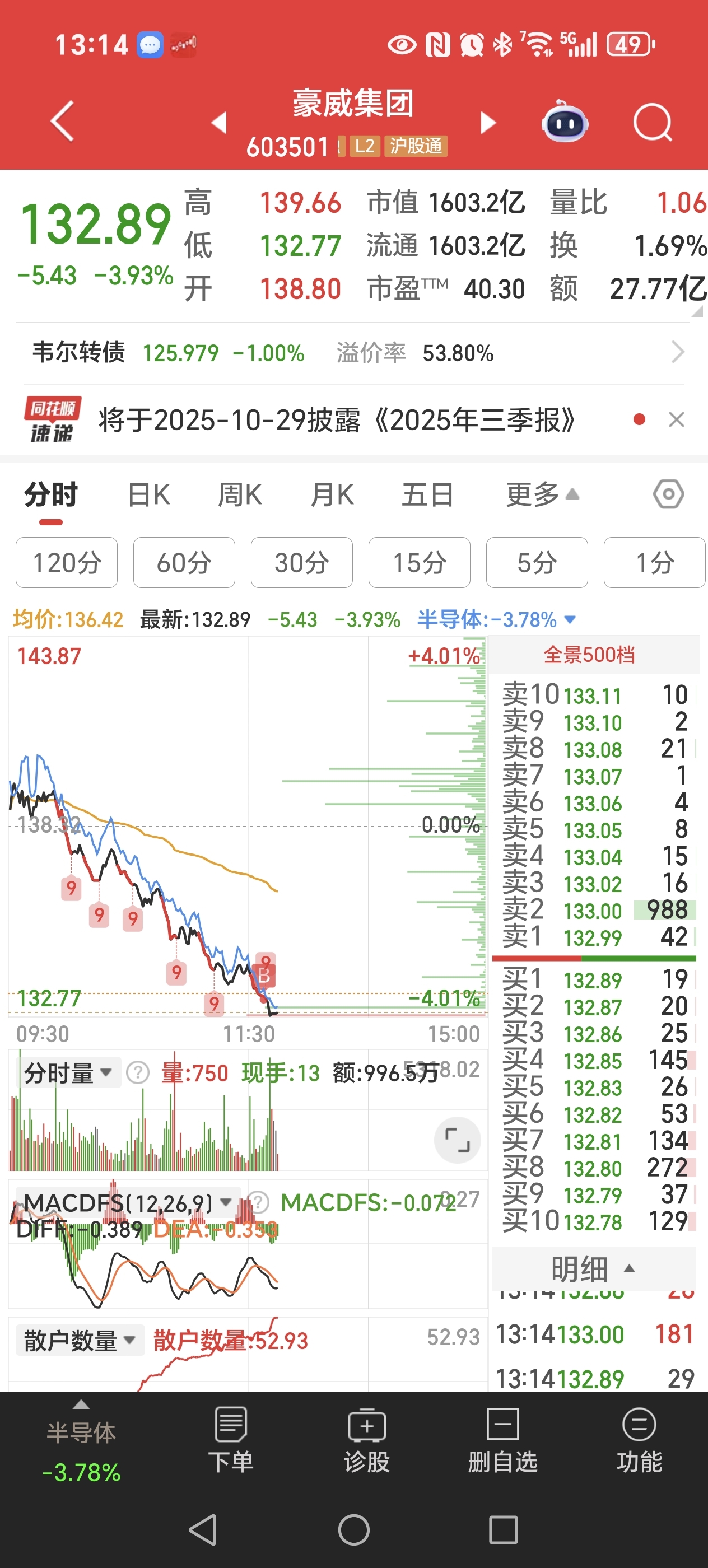 $豪威集团(SH603501)$ 昨天138清了,今天133打个底仓回来,如果跌到128-130再看情况补了,就这样