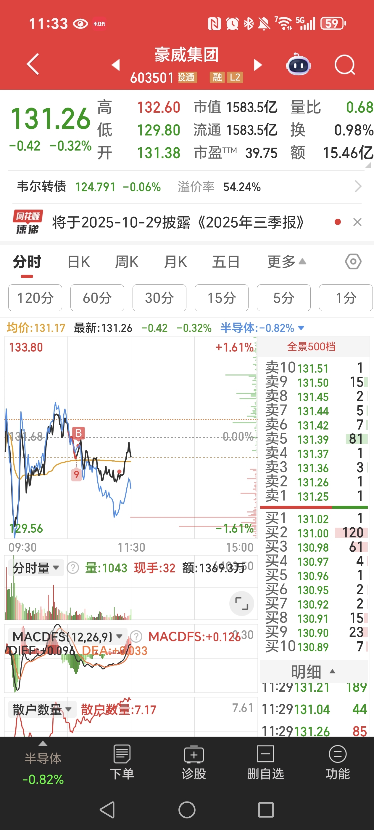 $豪威集团(SH603501)$ 今天最低点半年线位置反弹,那会还没睡醒,错过了本来计划给到128-130的价格会补一些,知行合一。目前已经来到130附近,就看这个位置能不能企稳等着反弹吧,个人认为如果跌破这个区间,豪威短期就走坏了,可能调整时间就要拉长,今天补了两次,如果跌破今天最低点也不会再补仓了,这是生命线