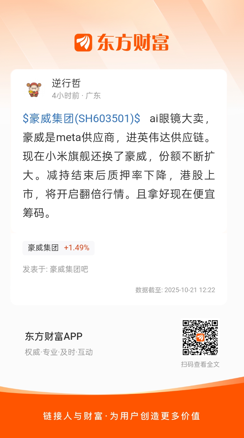 $豪威集团(SH603501)$ ai眼镜大卖,豪威是meta供应商,进英伟达供应链。现在小米旗舰还换了豪威,份额不断扩大。减持结束后质押率下降,港股上市,将开启翻倍行情。且拿好现在便宜筹码。
