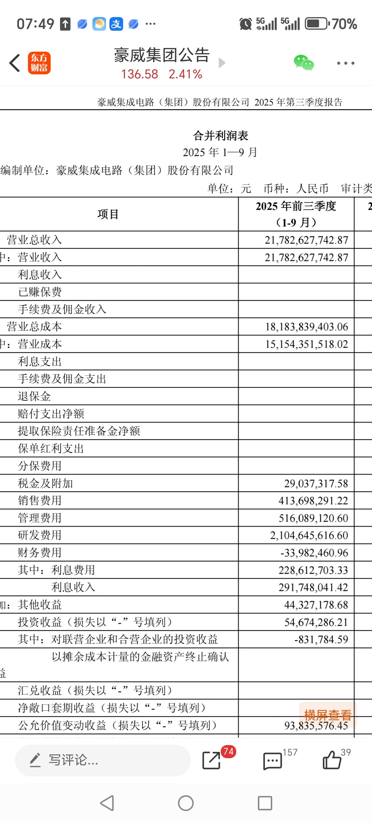 $豪威集团(SH603501)$ 豪威集团前三季度研发费用21亿,算上21亿,前三季度利润实际增长至少70%,