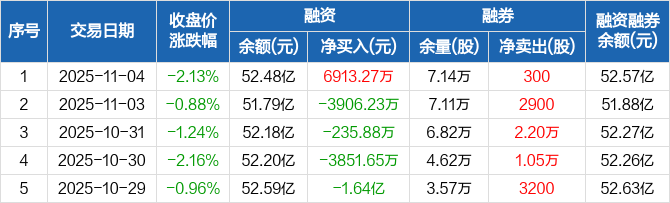 豪威集团:融资净买入6913.27万元,融资余额52.48亿元(11-04)