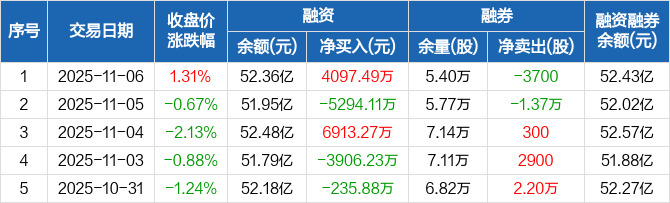 豪威集团:融资净买入4097.49万元,融资余额52.36亿元(11-06)