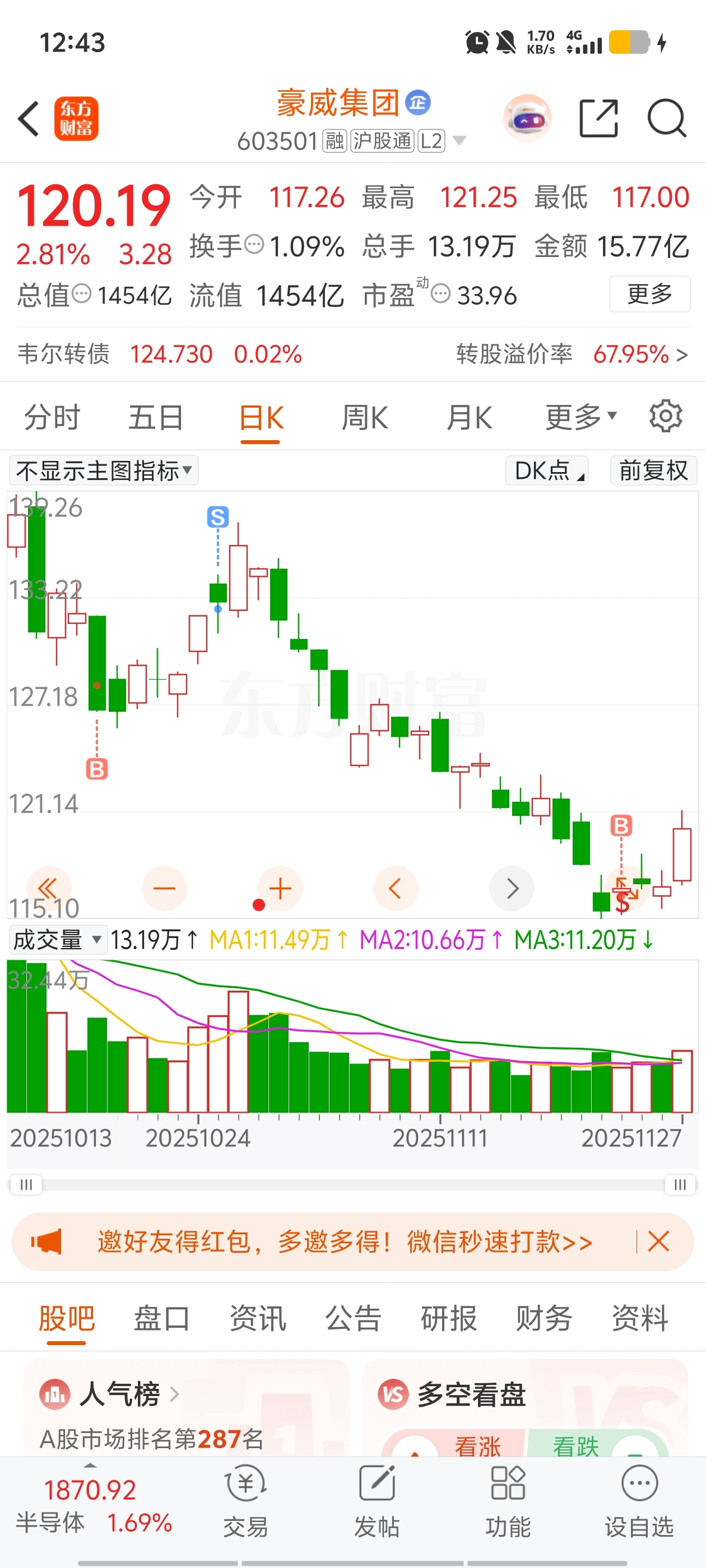 $豪威集团(SH603501)$ 明天过不了20日线就先撤了。