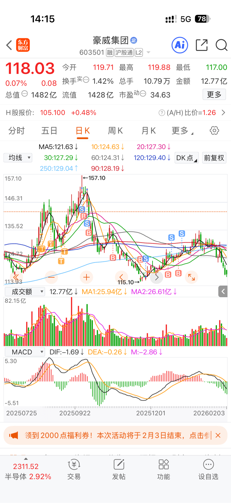 $豪威集团(SH603501)$ 买这个的大多数都是废材,包括我自己,虽然CPO赚了两倍,但是,买这个确实太了