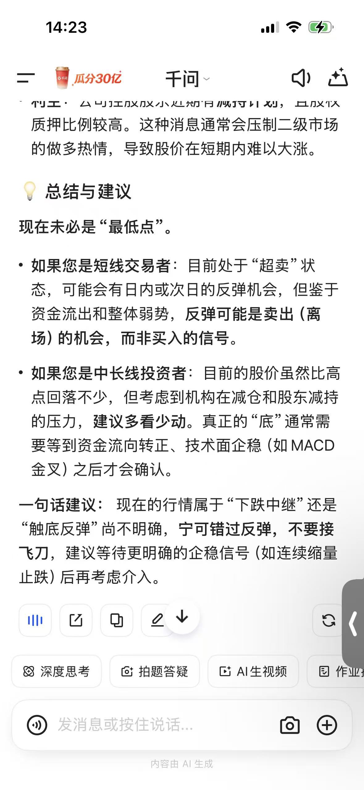 千问都说:反弹可能是卖出(离场)的机会,而非买入的信号。唉,我们这些散户咋办了。