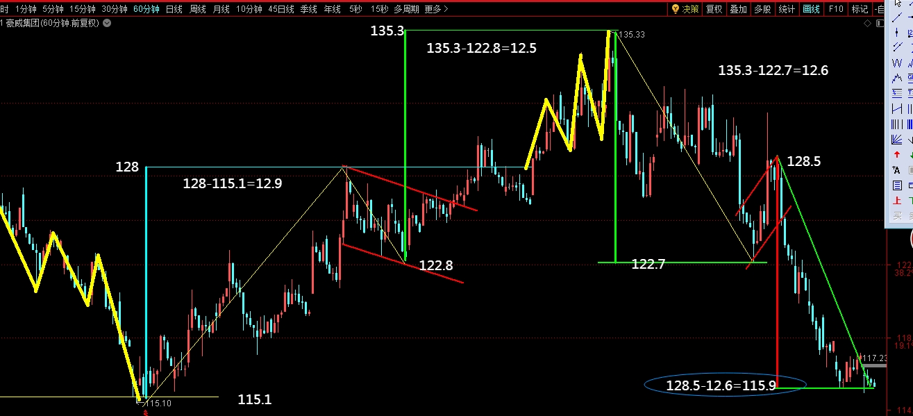 $豪威集团(SH603501)$ 115.9见底,这就是底!我从未怀疑自己的方法,如果不对一定是取值错了,左侧下飘旗形右侧上飘旗形,如果右侧有第三波跌幅117.2-12.6那老y质押指定爆仓!