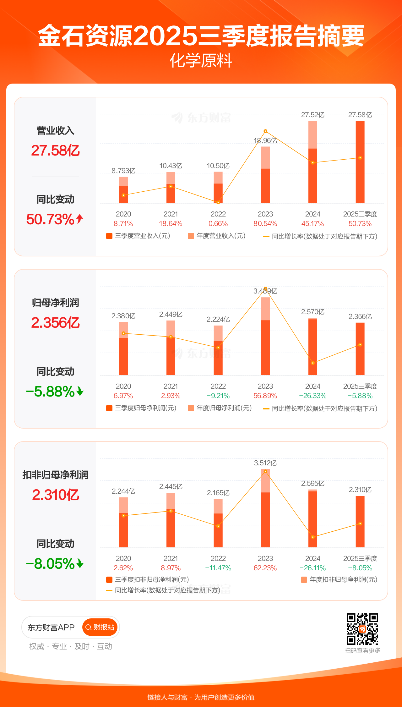 金石资源10月29日发布2025年三季报显示,公司前三季实现营业收入27.58亿元,同比增长50.73%;归母净利润2.36亿元,同比下滑5.88%;扣非归母净利润2.31亿元,同比下滑8.05%。