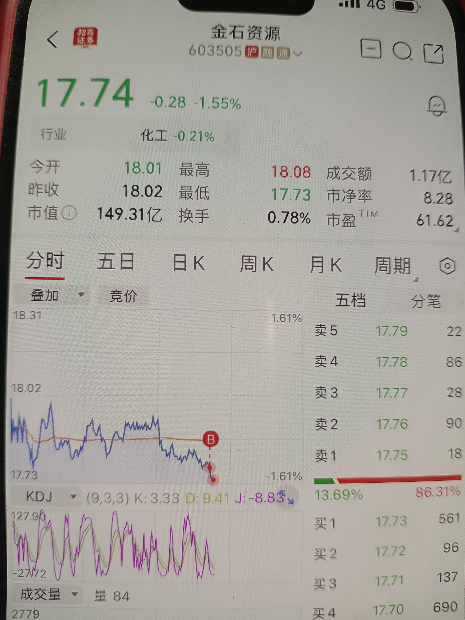$金石资源(SH603505)$ 早上17.73就挂了买单现在才成交。今天下跌适合慢慢买。这个位置不怕跌。