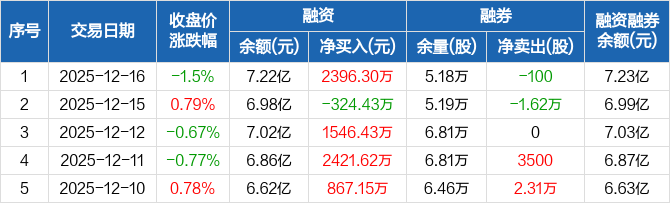 融资方面,当日融资买入3793.99万元,融资偿还1397.69万元,融资净买入2396.3万元。融券方面,融券卖出200股,融券偿还300股,融券余量5.18万股,融券余额91.69万元。融资融券余额合计7.23亿元。