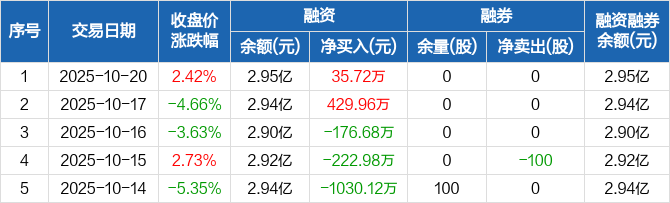 振江股份:融资净买入35.72万元,融资余额2.95亿元(10-20)