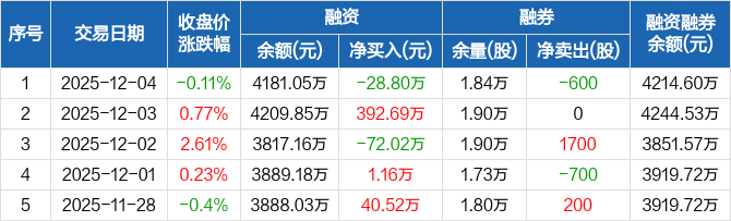 欧普照明:融资净偿还28.8万元,融资余额4181.05万元(12-04)