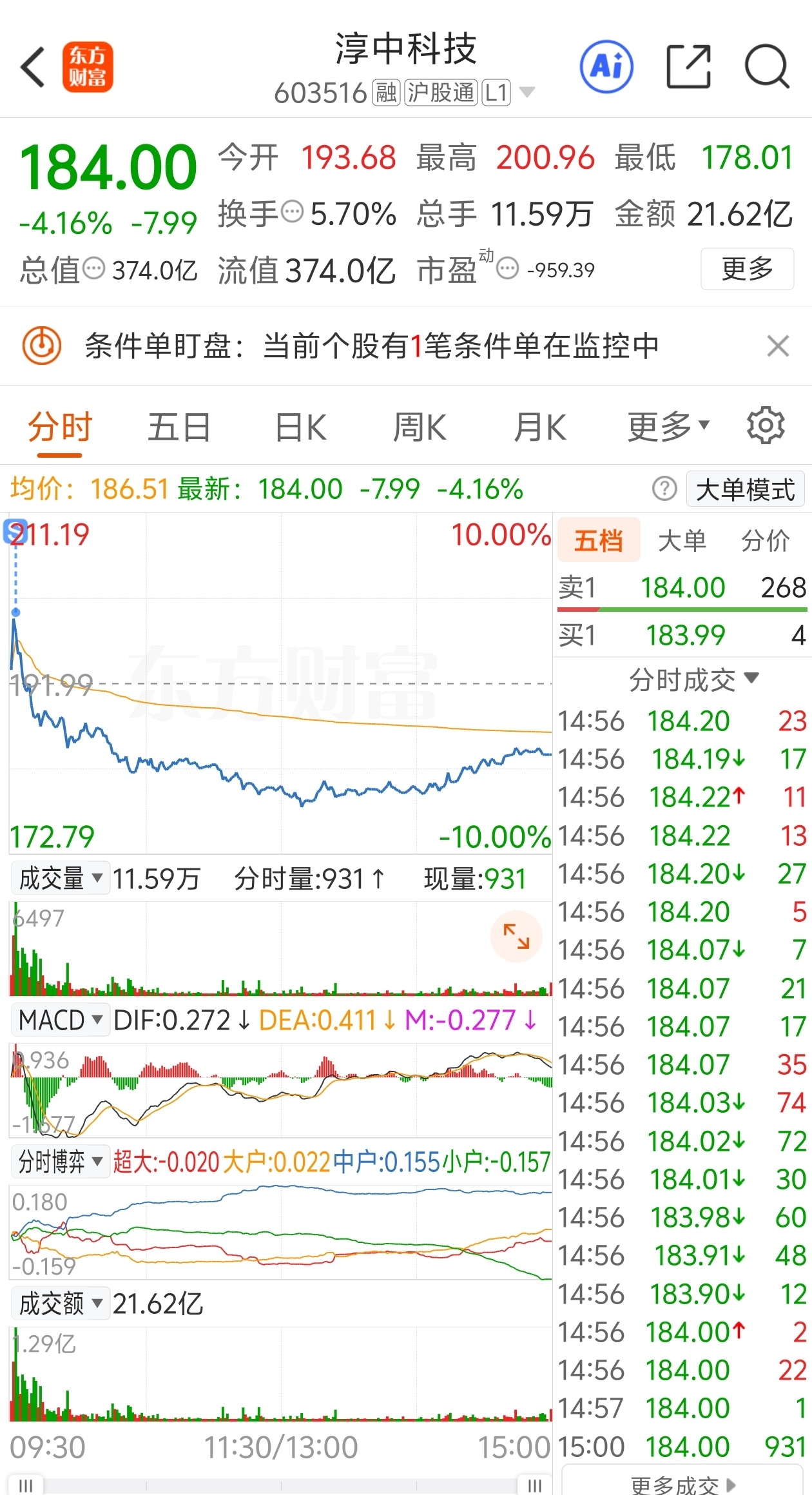 $淳中科技(SH603516)$ 明天5日均线175-178之间后面还有上涨机会