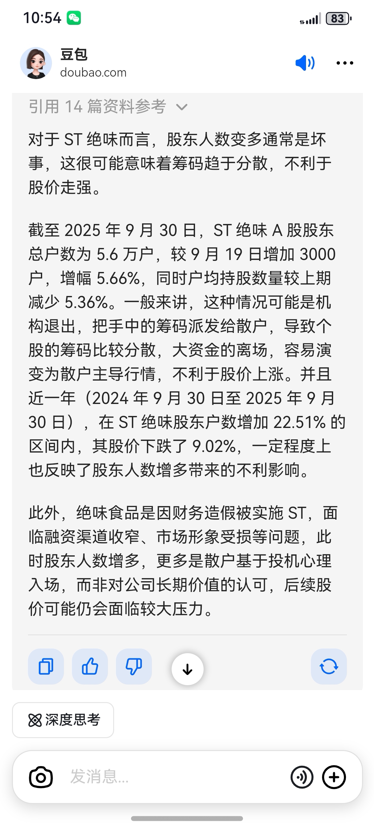 $ST绝味(SH603517)$ 股东人数变多,对股价不利啊!