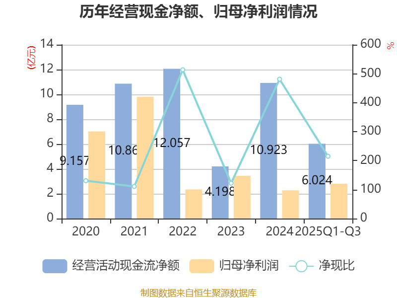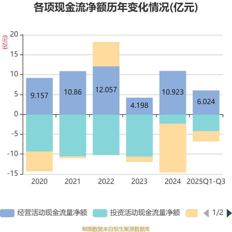 2025年前三季度,公司经营活动现金流净额为6.02亿元,同比下降34.88%;筹资活动现金流净额-2.56亿元,同比增加6.81亿元;投资活动现金流净额-4.24亿元,上年同期为-6569.27万元。
