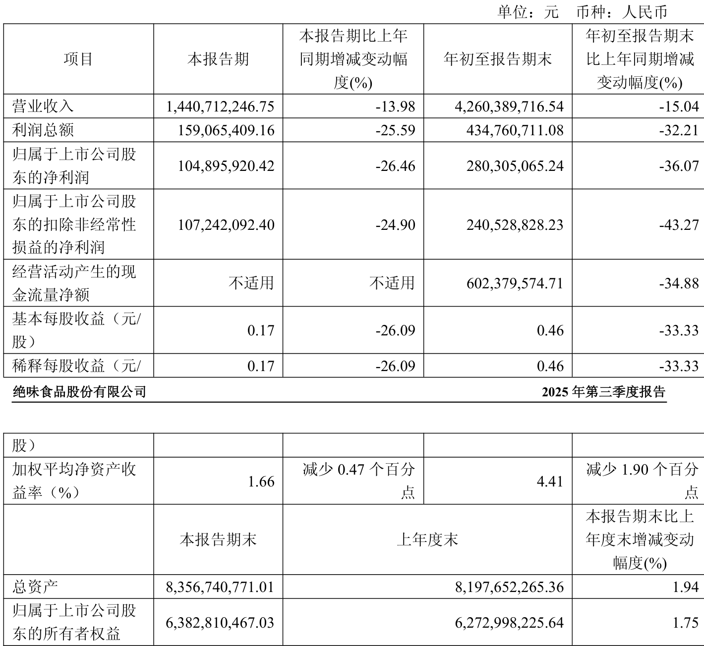 中证智能财讯 ST绝味(603517)10月29日披露2025年第三季度报告。前三季度公司实现营业总收入42.6亿元,同比下降15.04%;归母净利润2.8亿元,同比下降36.07%;扣非净利润2.41亿元,同比下降43.27%;经营活动产生的现金流量净额为6.02亿元,同比下降34.88%;报告期内,ST绝味基本每股收益为0.46元,加权平均净资产收益率为4.41%。