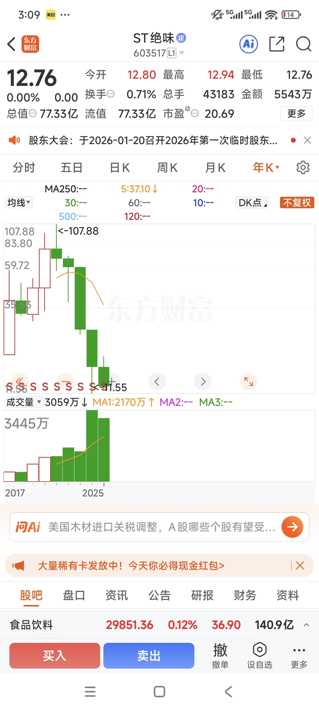 $ST绝味(SH603517)$ 为何很多人巨亏?都是选股上出现问题,选股先观察年线,凡历史上暴炒三倍之上票,至少熊五年,有的到十年都无戏,为何这样,上方层层叠叠套牢盘没5年之上难消化。看看这绝味,从上市20元左右↗105元,翻了5倍,这种票5年都别碰它,都无大戏,现在己经5年调了,至于什么时能起来,不好说,但比前5年买进人好多了。
