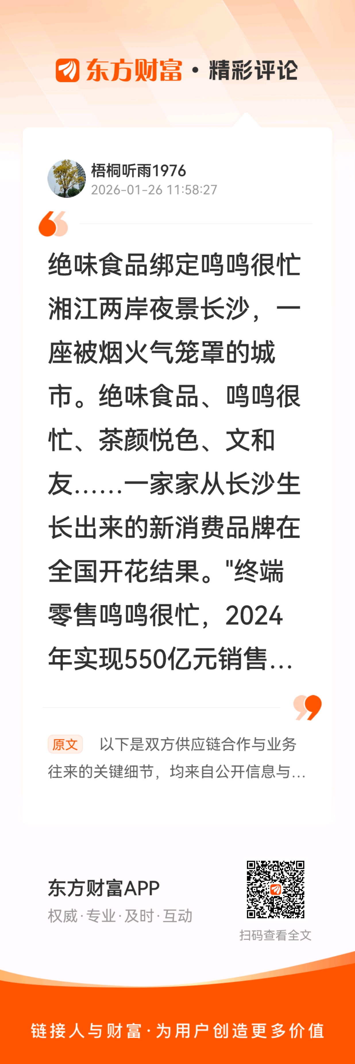 //@梧桐听雨1976 :绝味食品绑定鸣鸣很忙湘江两岸夜景长沙,一座被烟火气笼罩的城市。绝味食品、鸣鸣很忙、茶颜悦色、文和友……一家家从长沙生长出来的新消费品牌在全国开花结果。"终端零售鸣鸣很忙,2024年实现550亿元销售额,拥有零食很忙与赵一鸣零食两个品牌。集团通过合并后运营约2.1万家店面,是卤味三巨头之一的绝味食品(以下简称绝味)的基本盘。根据公开信息,绝味食品与鸣鸣很忙之间存在明确的“供应商-渠道”采销关系。绝味食品按订单为鸣鸣很忙的门店批量生产并供应预包装的鸭货、素菜等标准卤味产品,包括鸭脖、鸭翅、鸭掌、毛豆、藕片、海带结等。这种合作模式是基于商业采购协议的,双方通过规模效应来摊薄成本,且绝味食品的供应是鸣鸣很忙门店产品组合的重要组成部分。加油绝味食品!“风雨过后见彩虹!”一浪还比一浪高!