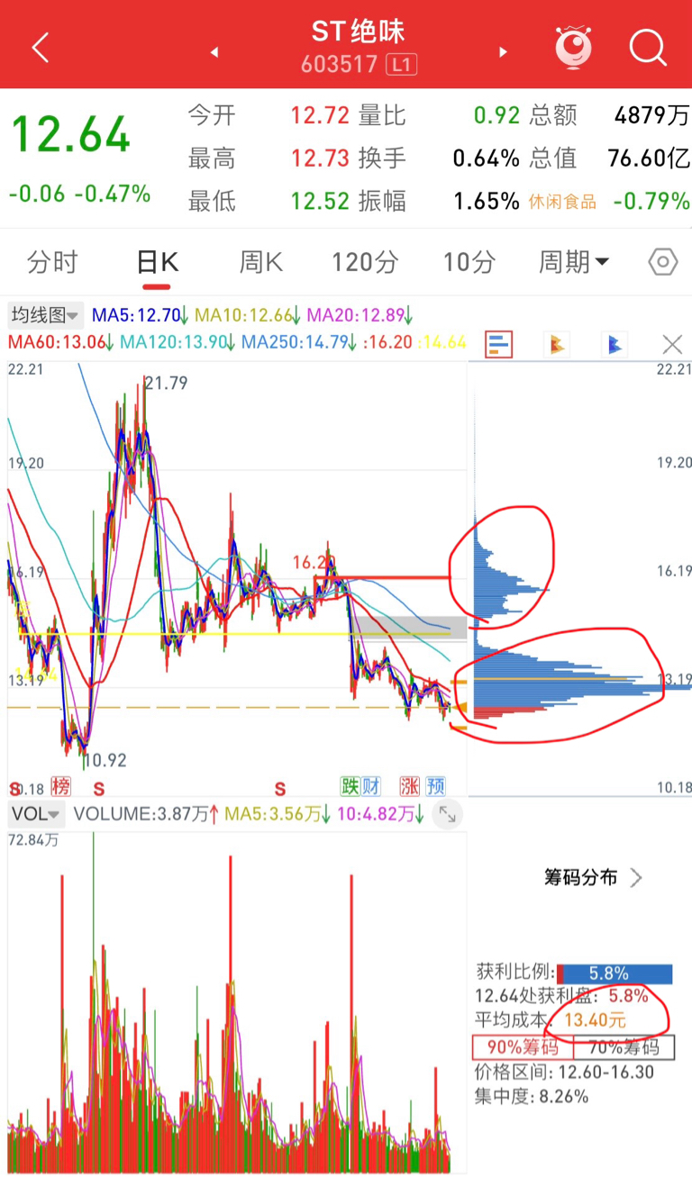 有的磨了,上方 16 块套住的散户朋友们不割肉 ,下方 13 这块的筹码不聚合。