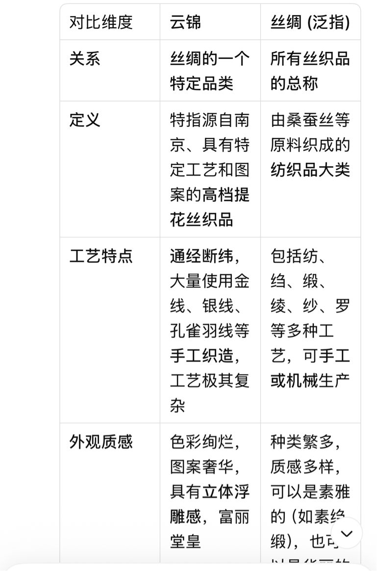$锦泓集团(SH603518)$ 这个应该可以解释清楚,云锦与丝绸的关系了吧,可以说云锦是丝织品的尖货,历史属于皇家专供,皇帝的龙袍就属于云锦工艺而成,此票目前已属于低估品种