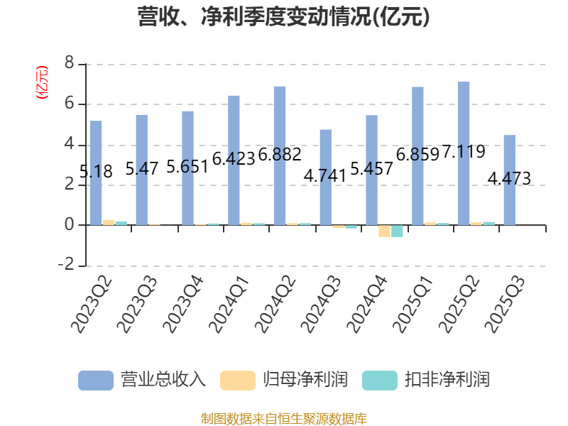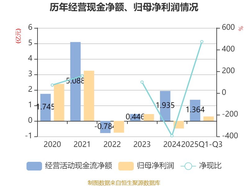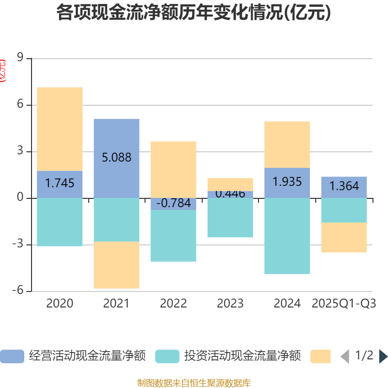 2025年前三季度,公司经营活动现金流净额为1.36亿元,同比增加1.42亿元;筹资活动现金流净额-1.93亿元,同比减少5.36亿元;投资活动现金流净额-1.59亿元,上年同期为-3亿元。