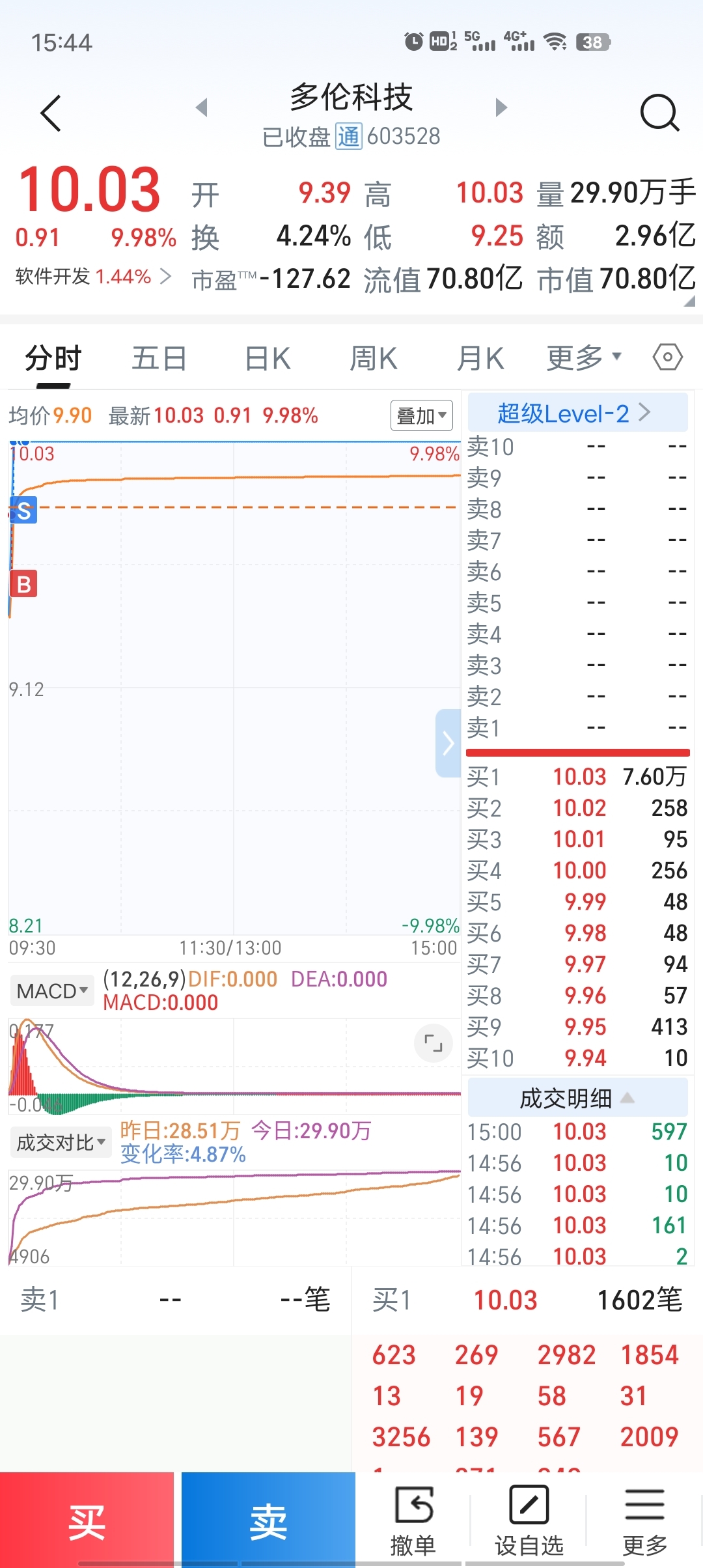 $多伦科技(SH603528)$ 星期四竞价干了半层仓位重了当天收盘就亏6个多点