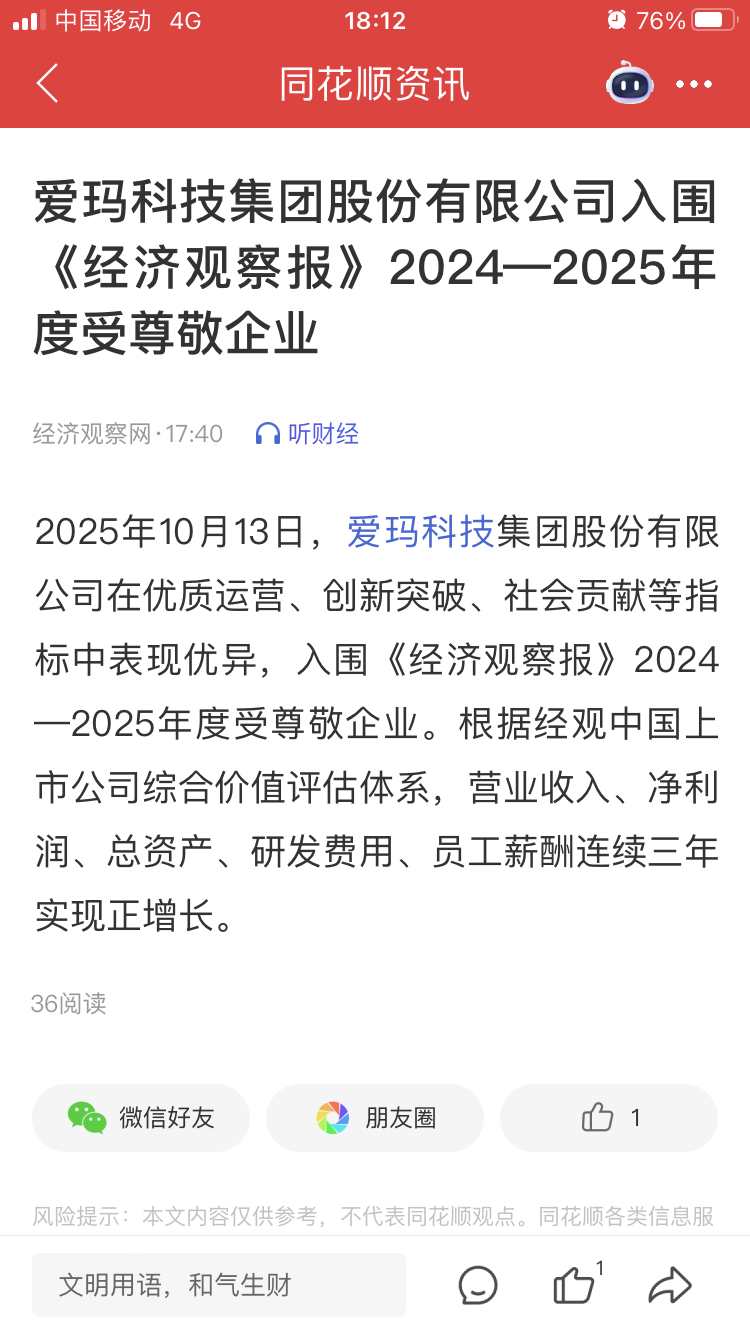 $爱玛科技(SH603529)$ 爱玛科技入围《经济观察报》2024—2025年度受尊敬企业