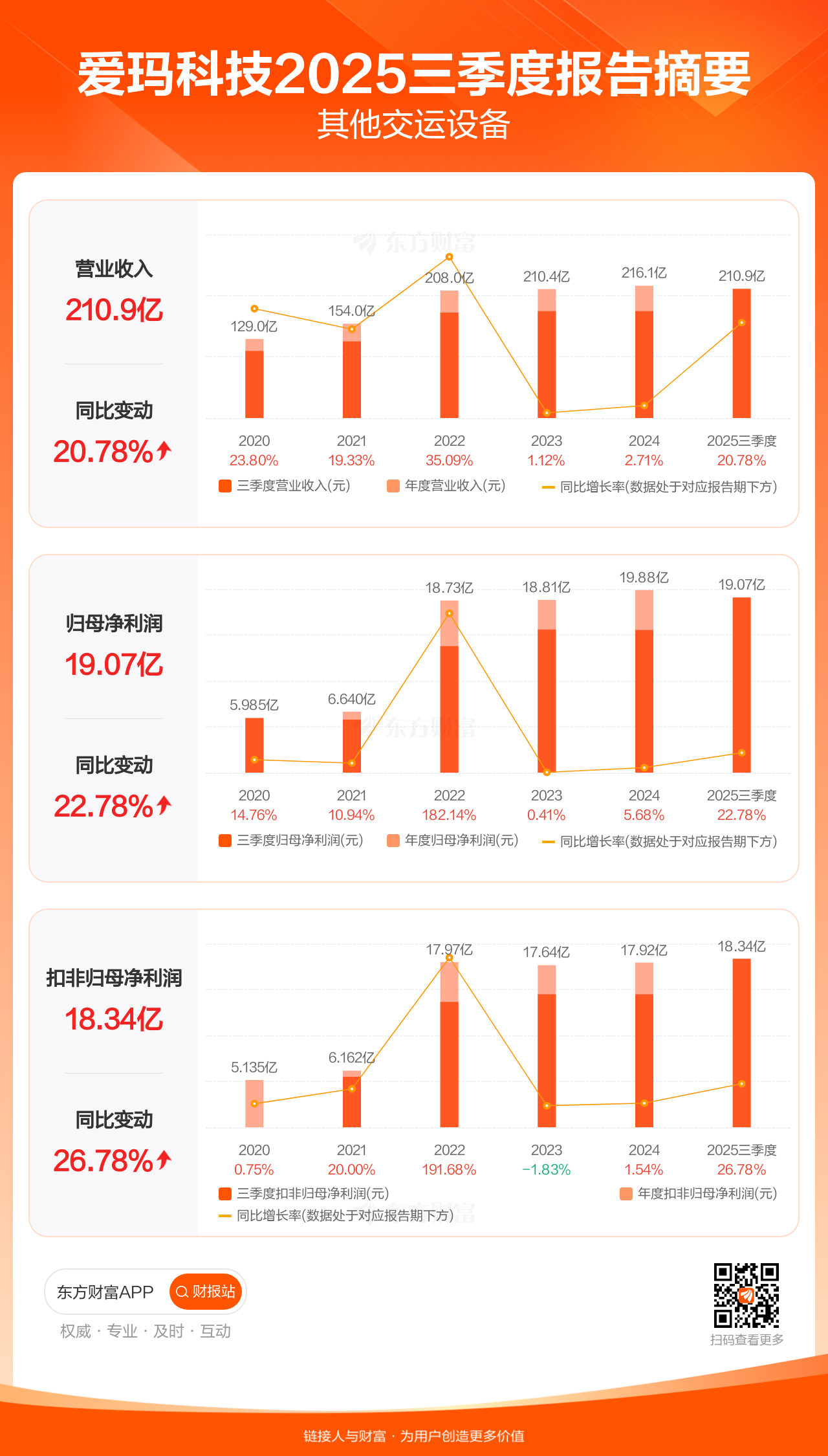 爱玛科技10月24日发布2025年三季报显示,公司前三季实现营业收入210.93亿元,同比增长20.78%;归母净利润19.07亿元,同比增长22.78%;扣非归母净利润18.34亿元,同比增长26.78%。