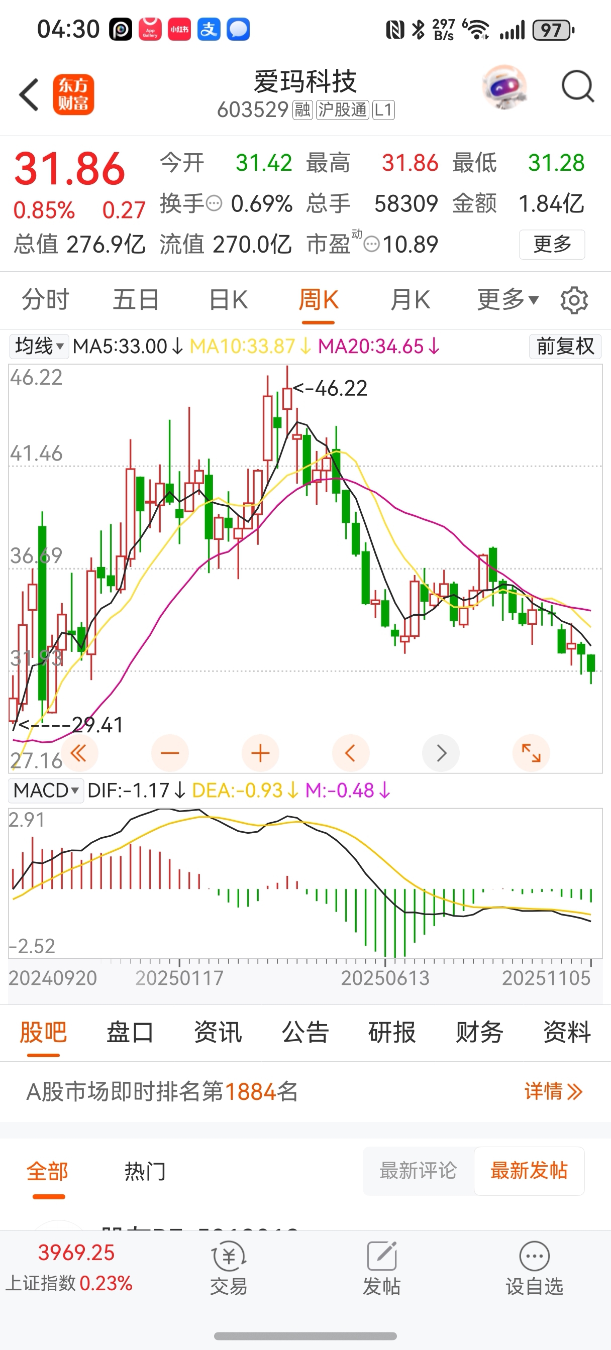 $爱玛科技(SH603529)$ 这波调整幅度达百分之三十多,而且是不管不顾大盘上涨百分之三十多的大牛市展开的,真的是杀人诛心,心狠手辣到极点,但是我大胆的预测,这波凶残的调整已经是穷途末路,而且近几个月,在四月份年报季报之前会创历史新高,并占稳五十元以上,拭目以待