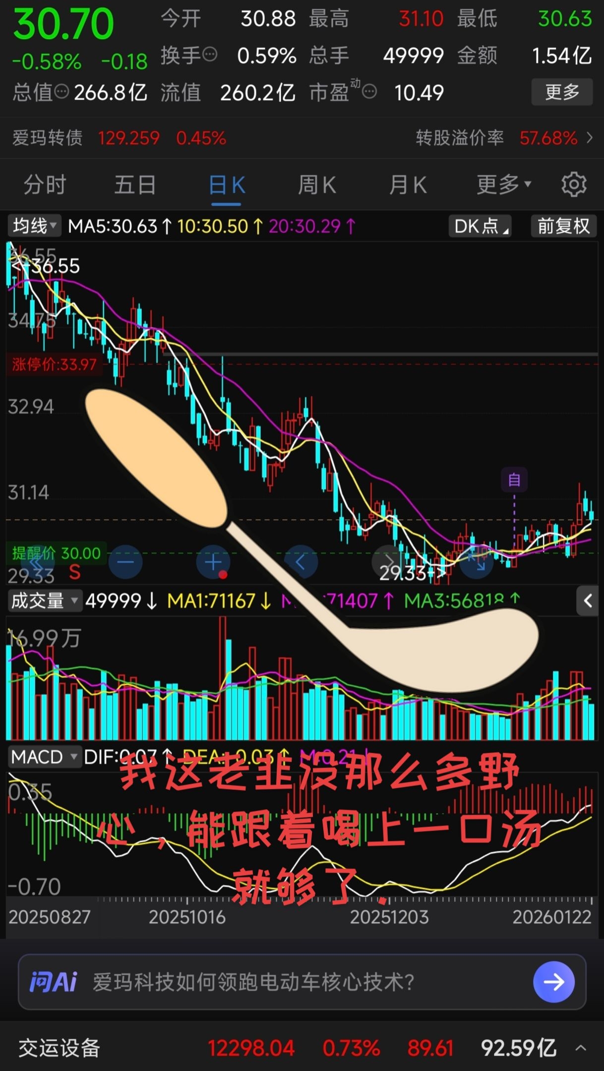 $爱玛科技(SH603529)$ 炒股策略就认准一种形态——我起名叫勺子战法。吃肉要去人扎堆的地方,我这老股民不求大富大贵,能分一口汤喝就心满意足,不急躁、不贪多,稳稳当当就好。