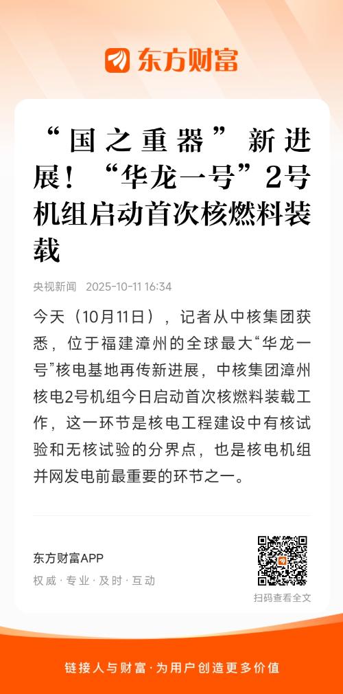 今天(10月11日),记者从中核集团获悉,位于福建漳州的全球最大“华龙一号”核电基地再传新进展,中核集团漳州核电2号机组今日启动首次核燃料装载工作,这一环节是核电工程建设中有核试验和无核试验的分界点,也是核电机组并网发电前最重要的环节之一。