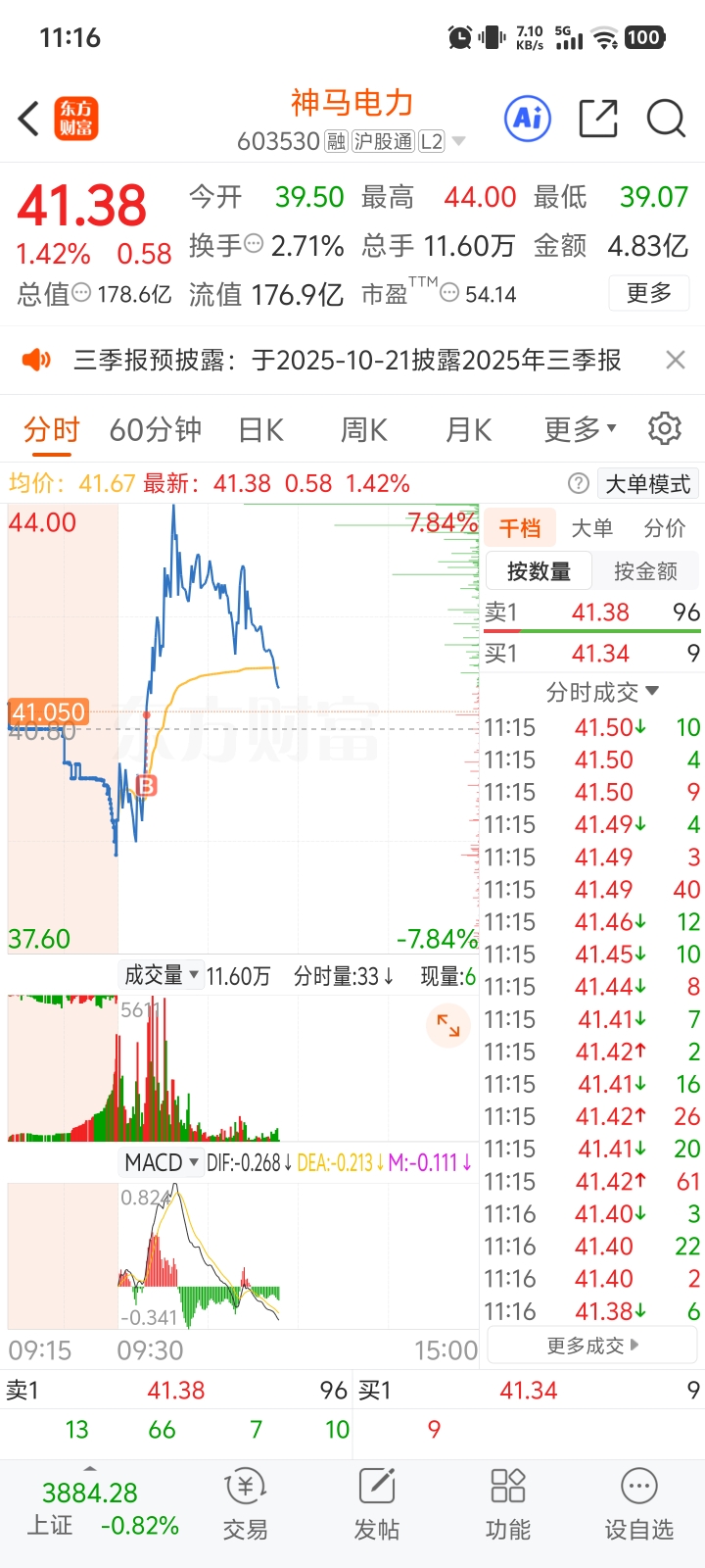$神马电力(SH603530)$ 今天看着好像是出货,不应该进