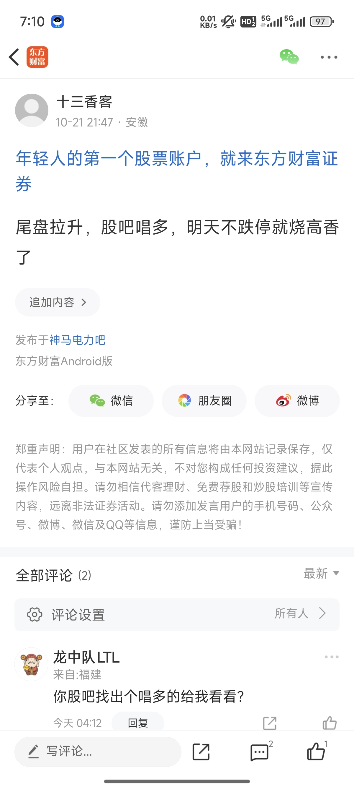 温馨提示: 1.根据《证券法》规定,禁止编造、传播虚假信息或者误导性信息,扰乱证券市场;2.用户在本社区发表的所有资料、言论等仅代表个人观点,与本网站立场无关,不对您构成任何投资建议。用户应基于自己的独立判断,自行决定证券投资并承担相应风险。《东方财富社区管理规定》