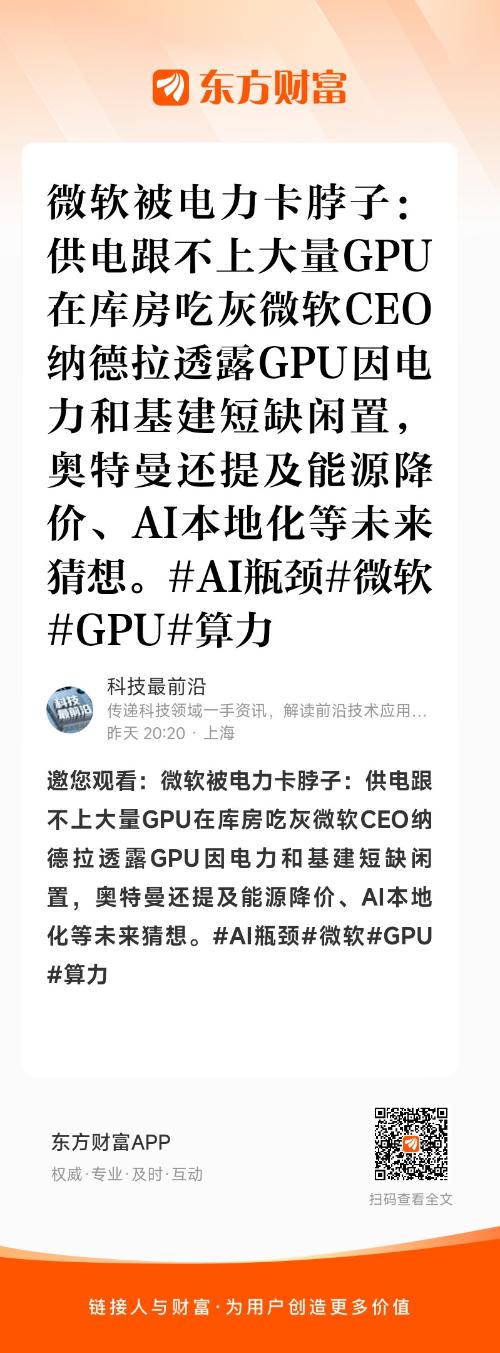 邀您观看:微软被电力卡脖子:供电跟不上大量GPU在库房吃灰微软CEO纳德拉透露GPU因电力和基建短缺闲置,奥特曼还提及能源降价、AI本地化等未来猜想。#AI瓶颈#微软#GPU#算力