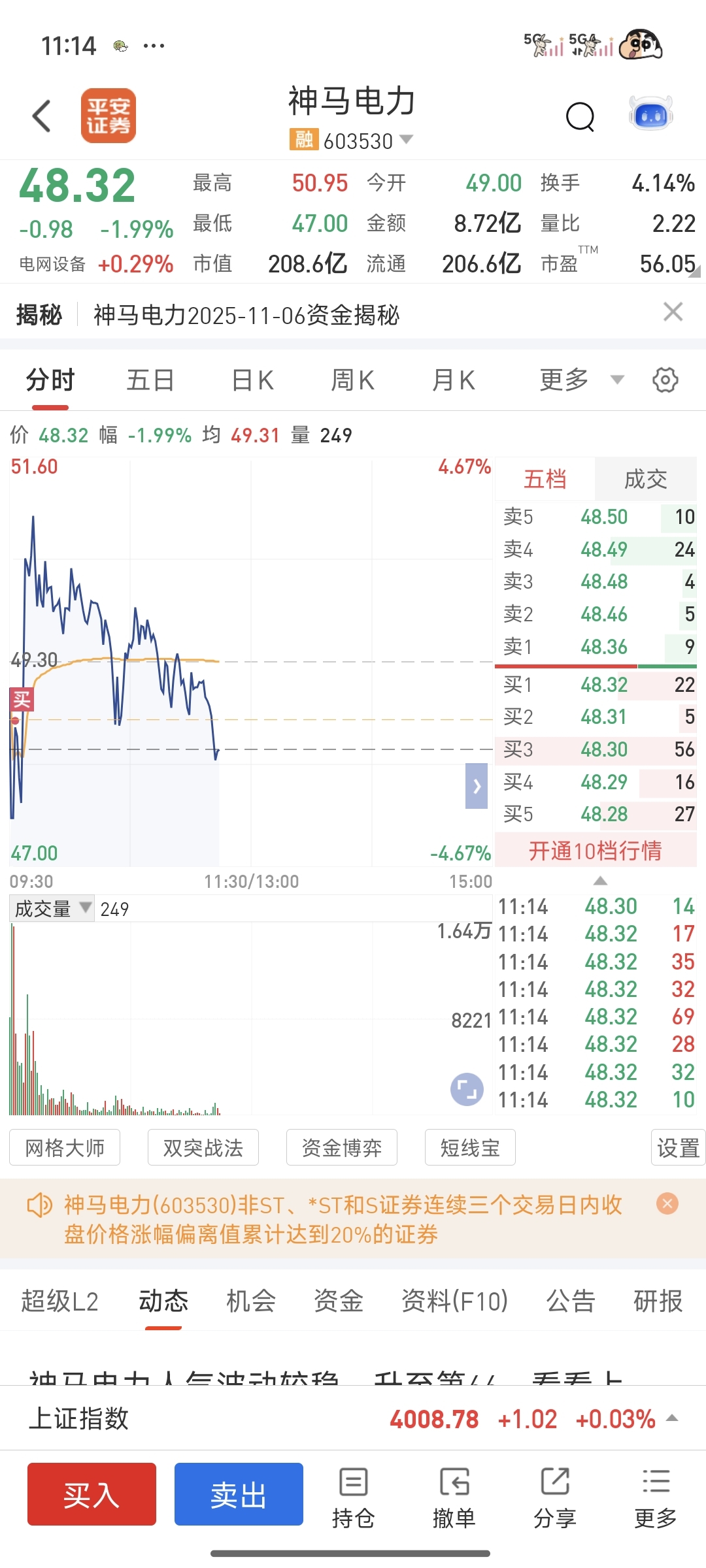 $神马电力(SH603530)$ 今天早上冲进来了不会要跌停吧