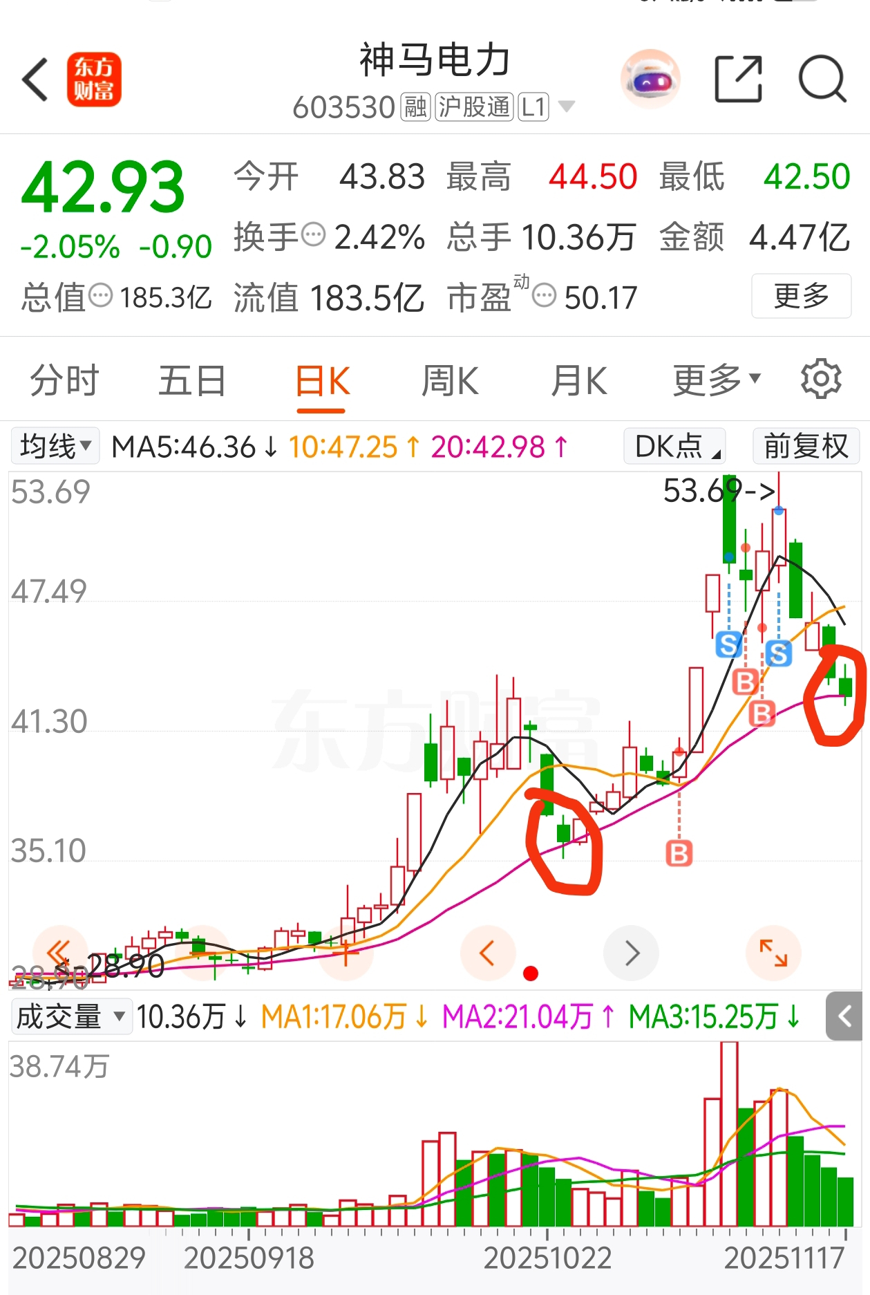 $神马电力(SH603530)$ 今日缩量回踩20日线,明日低开是好的买点