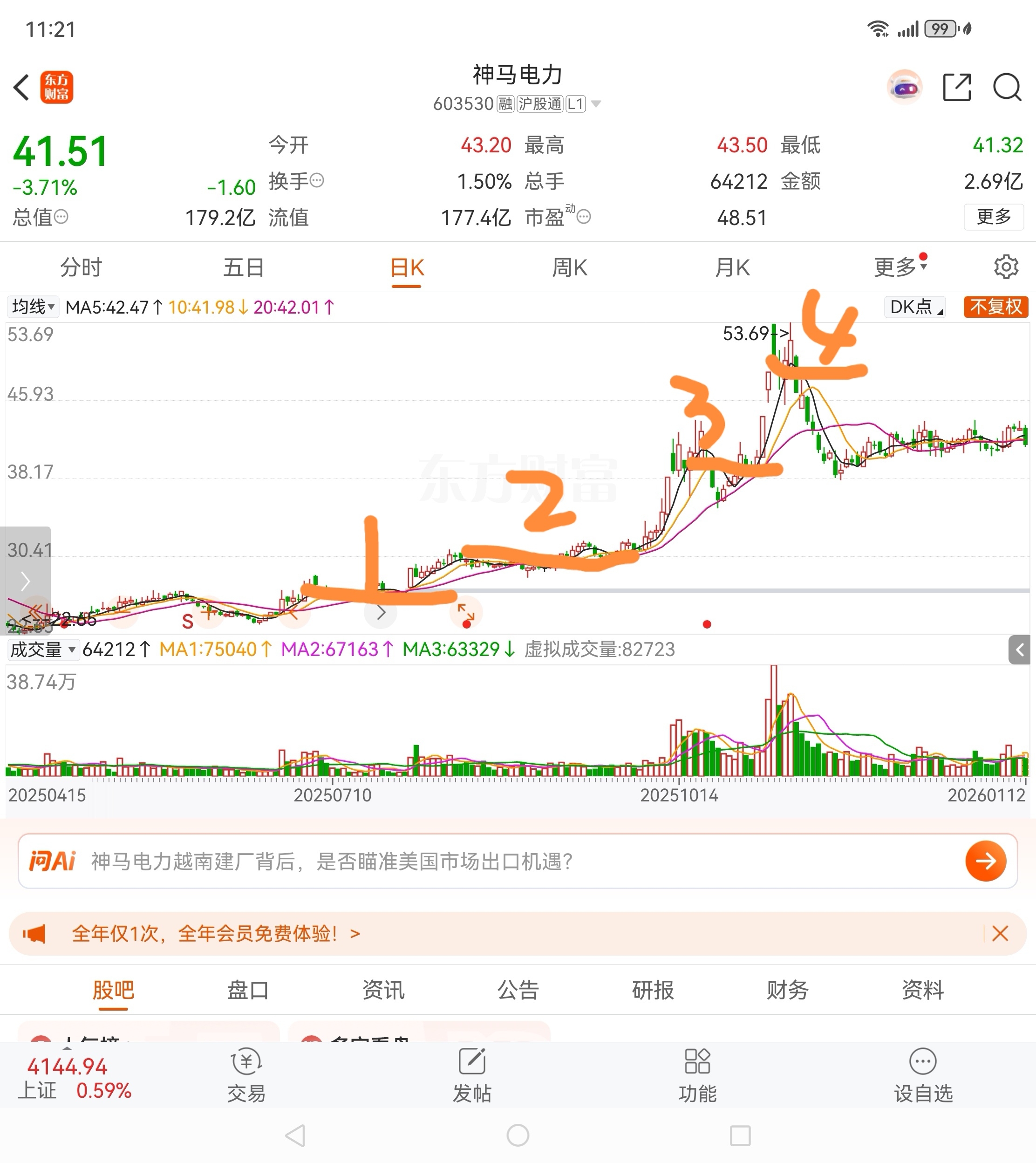 $神马电力(SH603530)$ 已经从20多到最高的53,现在回调了,大家还不跑等着被埋吗?