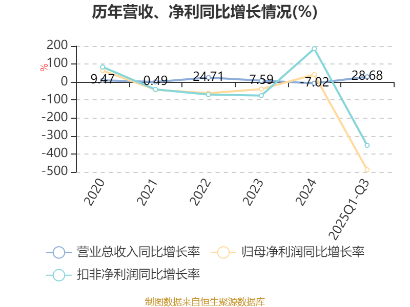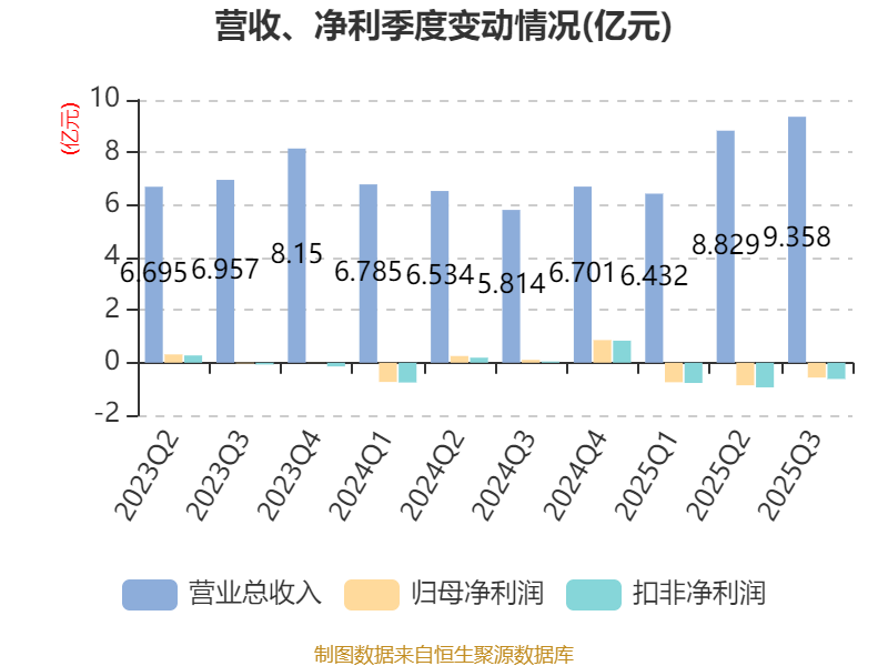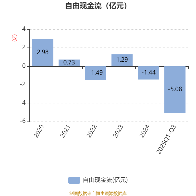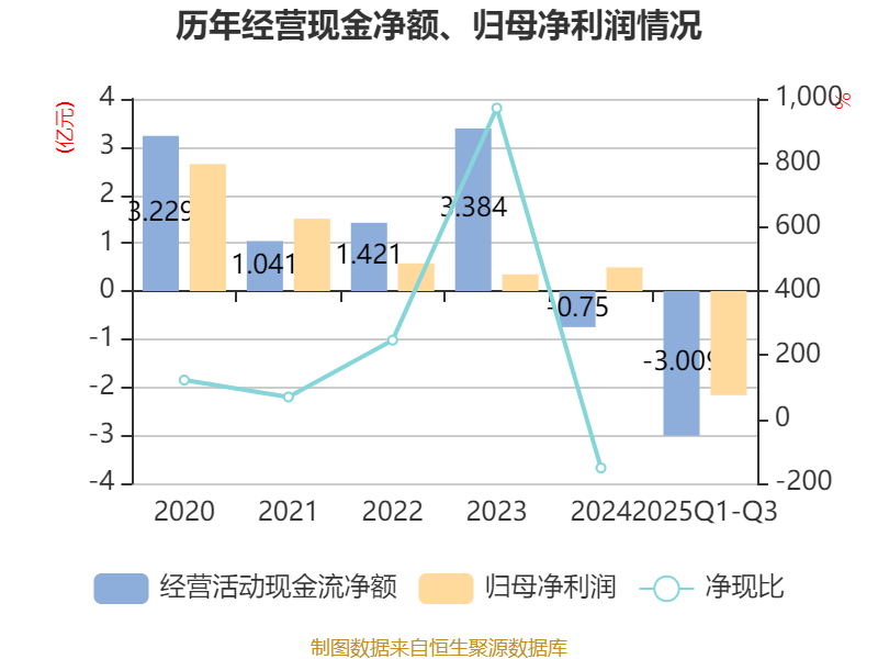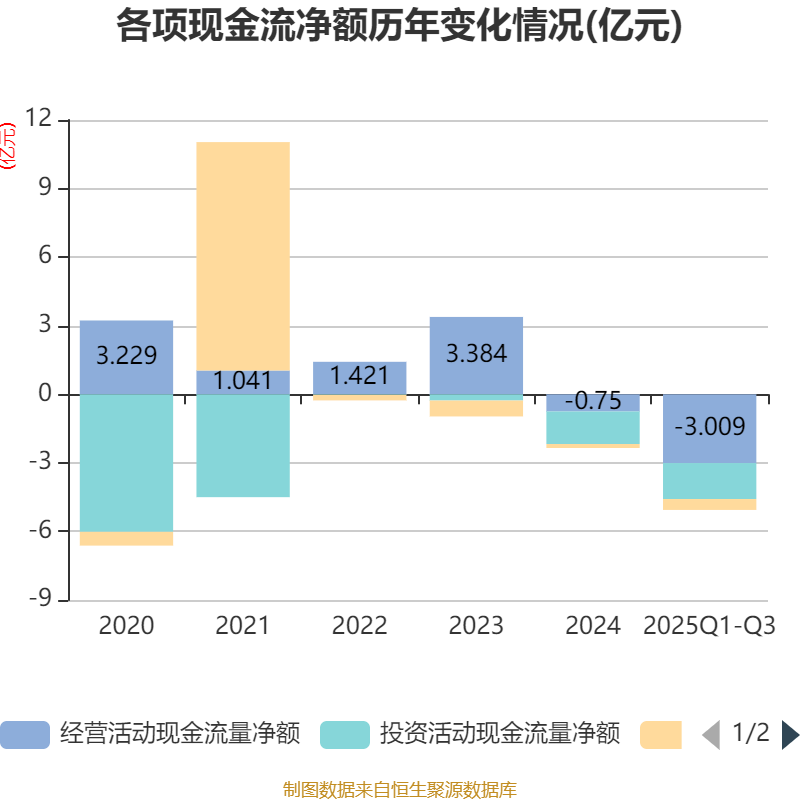 2025年前三季度,公司经营活动现金流净额为-3.01亿元,同比减少1.8亿元;筹资活动现金流净额-4759.71万元,同比减少3123.67万元;投资活动现金流净额-1.57亿元,上年同期为-6456.51万元。