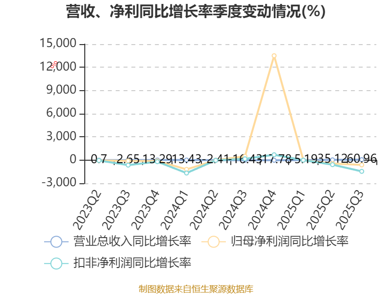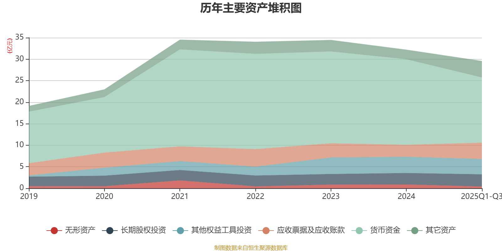 资产重大变化方面,截至2025年三季度末,公司货币资金较上年末减少23.87%,占公司总资产比重下降10.57个百分点;应收票据及应收账款较上年末增加37.12%,占公司总资产比重上升4.24个百分点;交易性金融资产合计较上年末增加305.37%,占公司总资产比重上升3.5个百分点;无形资产较上年末减少54%,占公司总资产比重下降1.37个百分点。