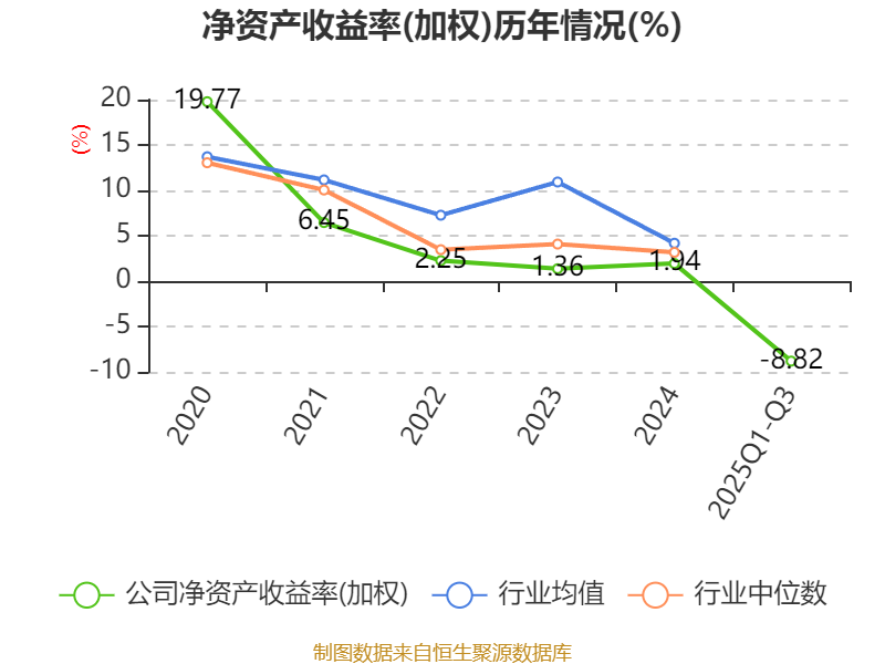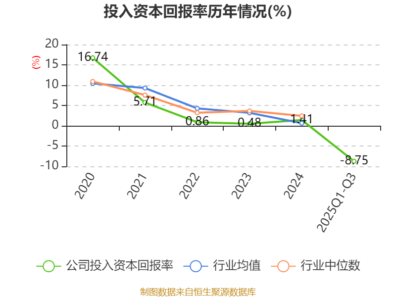 盈利能力方面, 2025年前三季度公司加权平均净资产收益率为-8.82%,同比下降7.35个百分点。公司2025年前三季度投入资本回报率为-8.75%,较上年同期下降6.65个百分点。