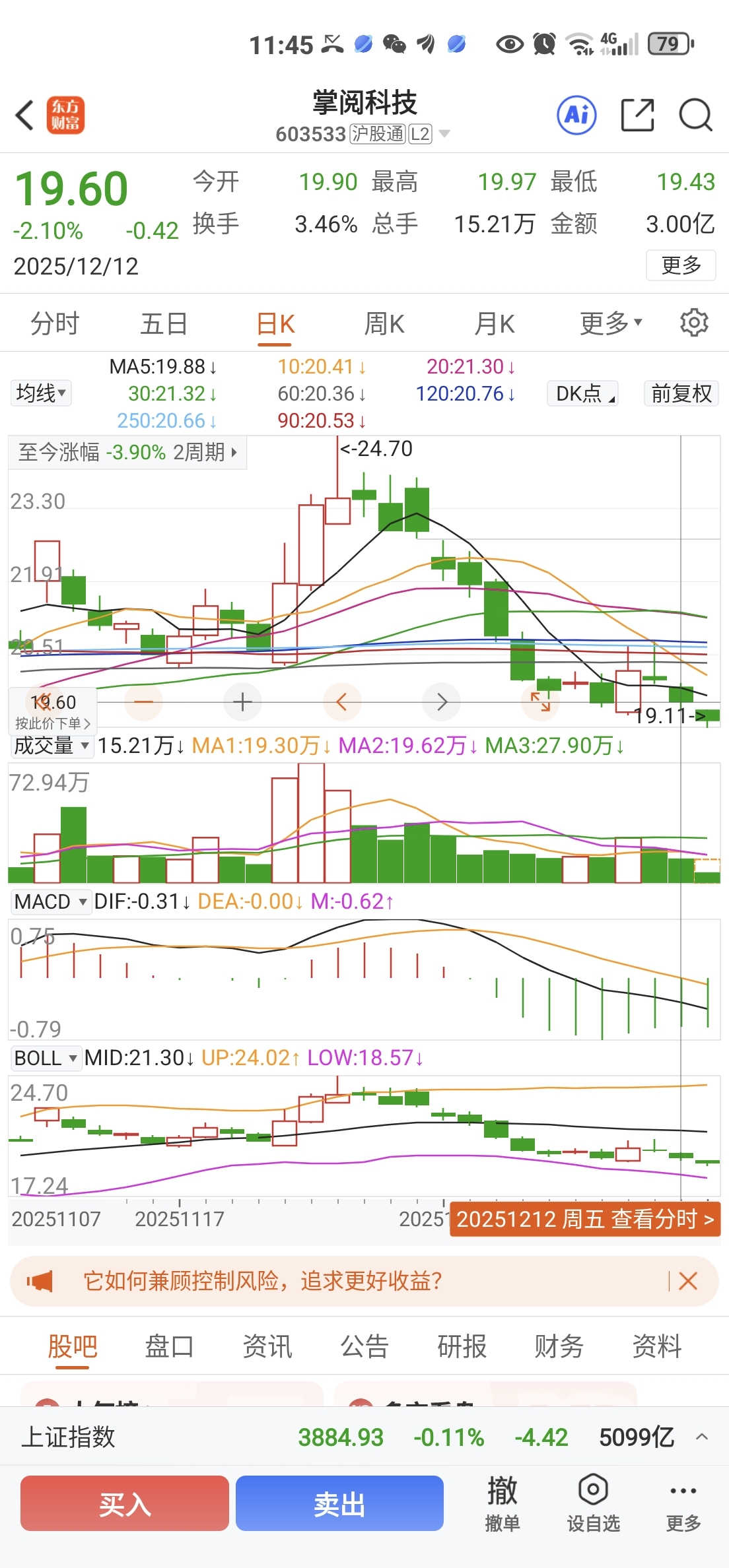 下午如果能偷袭冲到19.7附近再回落19.5收盘,那图形就完美了,标准搓揉!而且也能说明主力一直都在。如果没有那就确认走弱是下跌中继,布林下轨必摸,19必破,可怜的秦仪溯离它满仓22的成本越来越远了