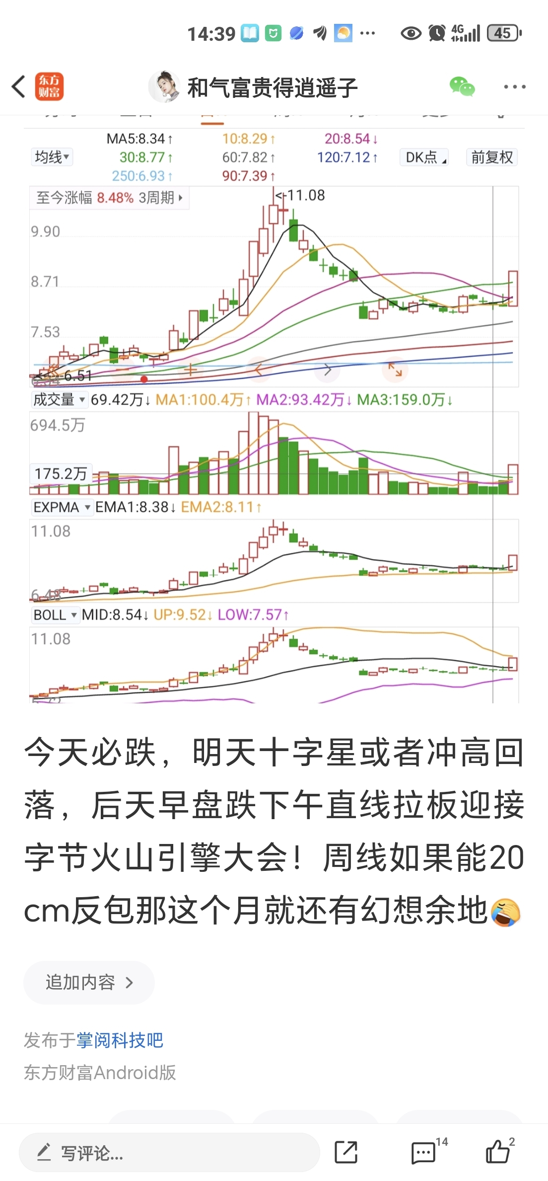 虽然没涨停,基本猜对,那明天就是中大阳拉回19.6毕竟周线那里还有一个19.6的