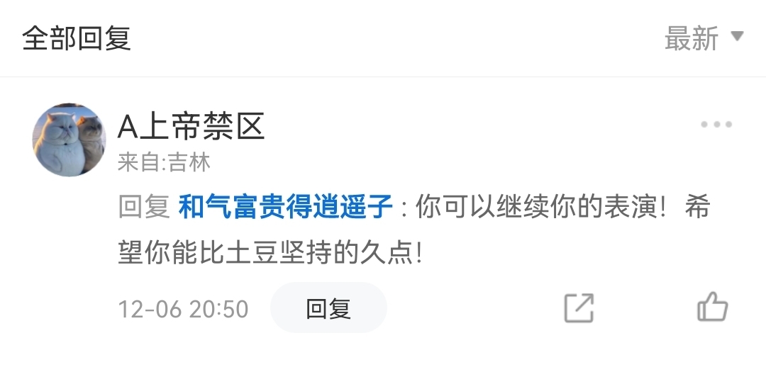 呵呵,可惜你跟土豆没有一个坚持久的!逍遥子就是了乐子。不过土豆、逍遥子这种人不会少,它们跟“三亚时间循环”一个德行,“脸”它们不存在的!浑身上下就“嘴”最硬!