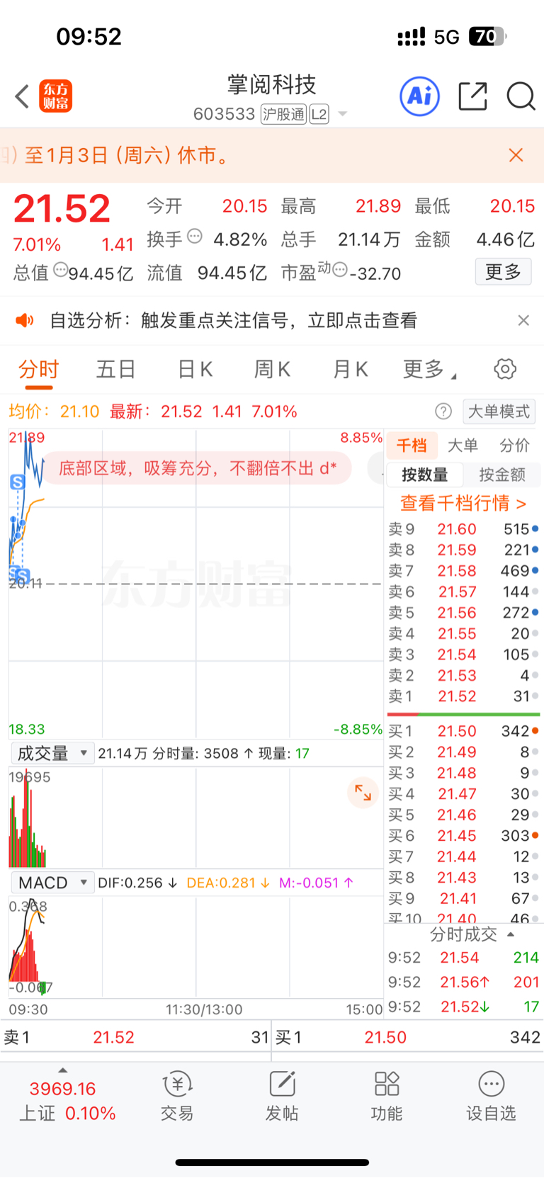 $掌阅科技(SH603533)$ 昨天拉尾盘,今天红开就是超预期,超预期开盘直接上冲。应该继续持有的,但是我却慌了神。总结原因不是主线。左侧压力位我先入为主,觉得今天只能冲高回落。