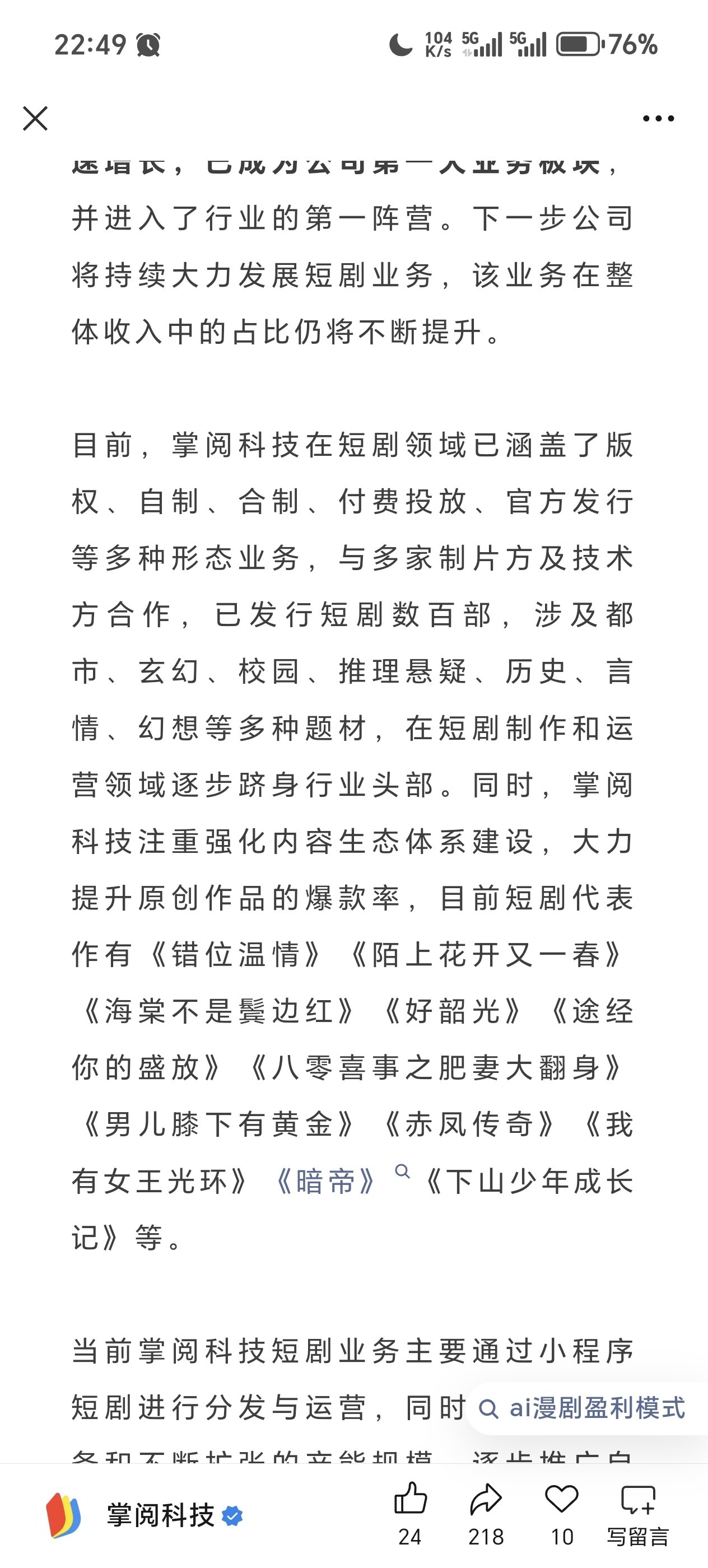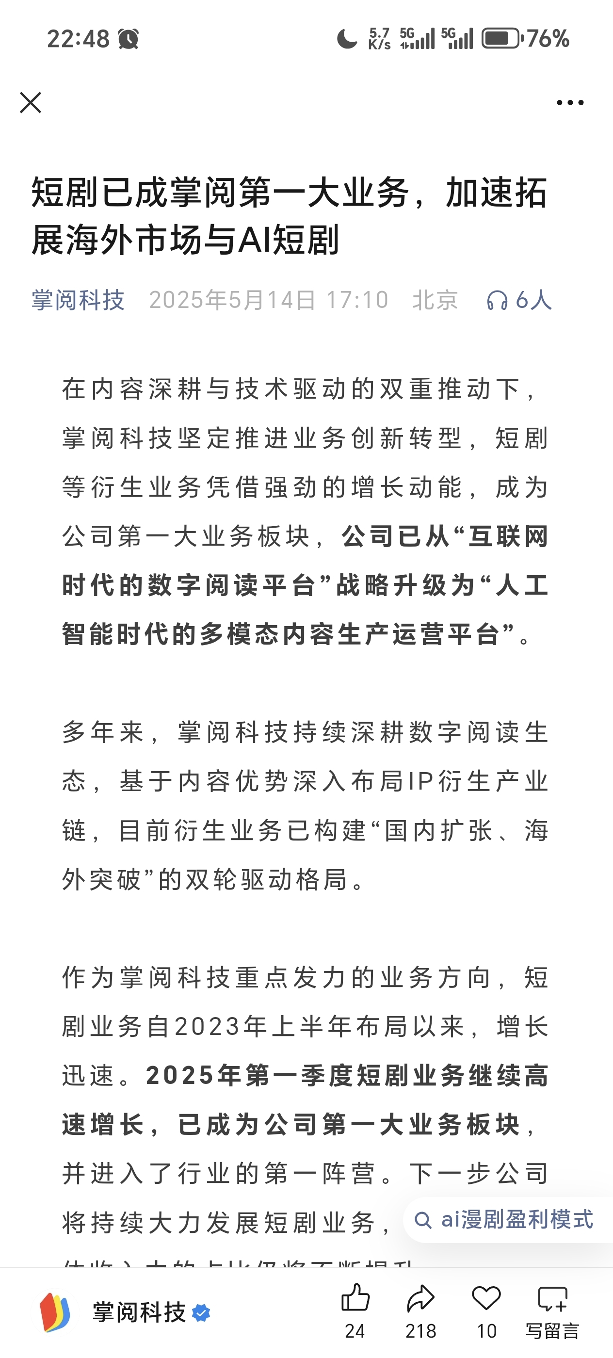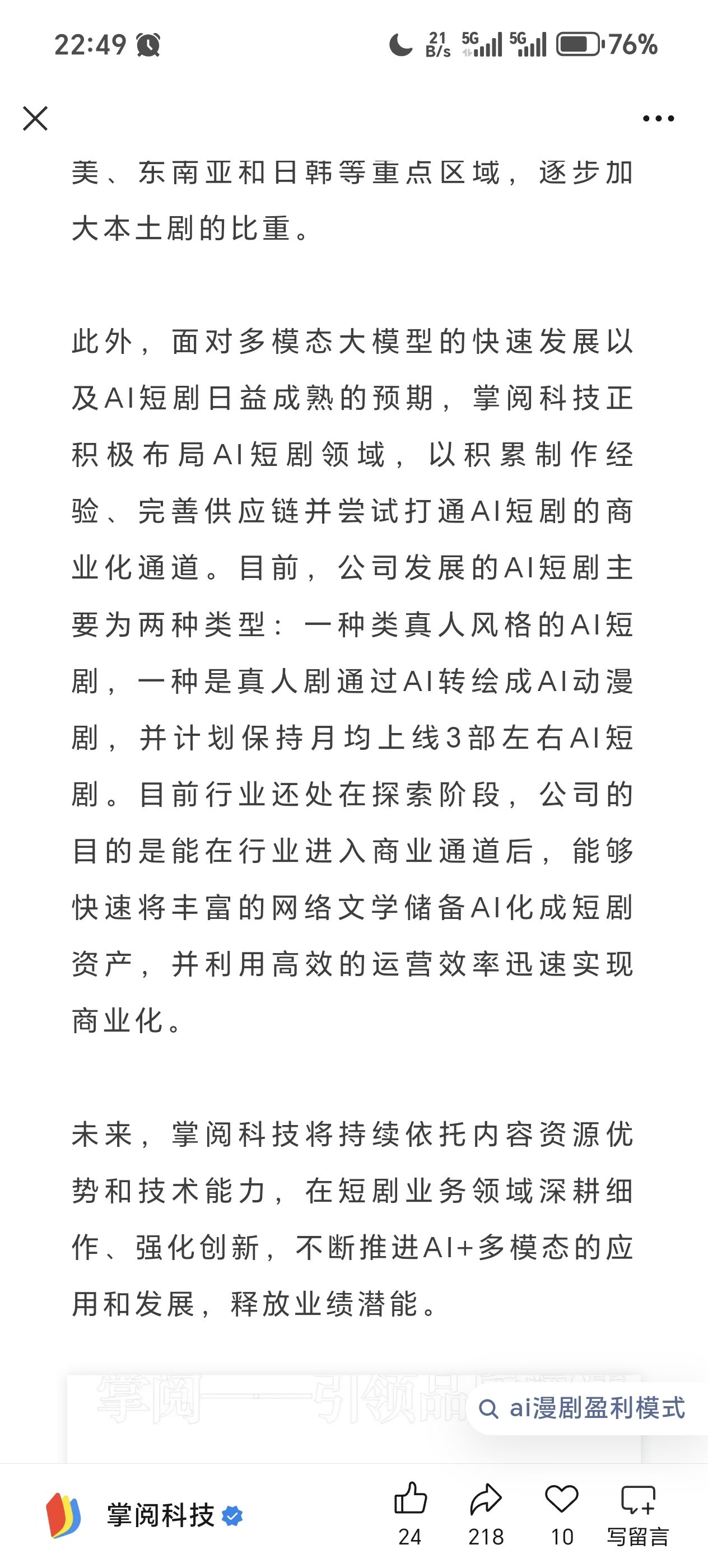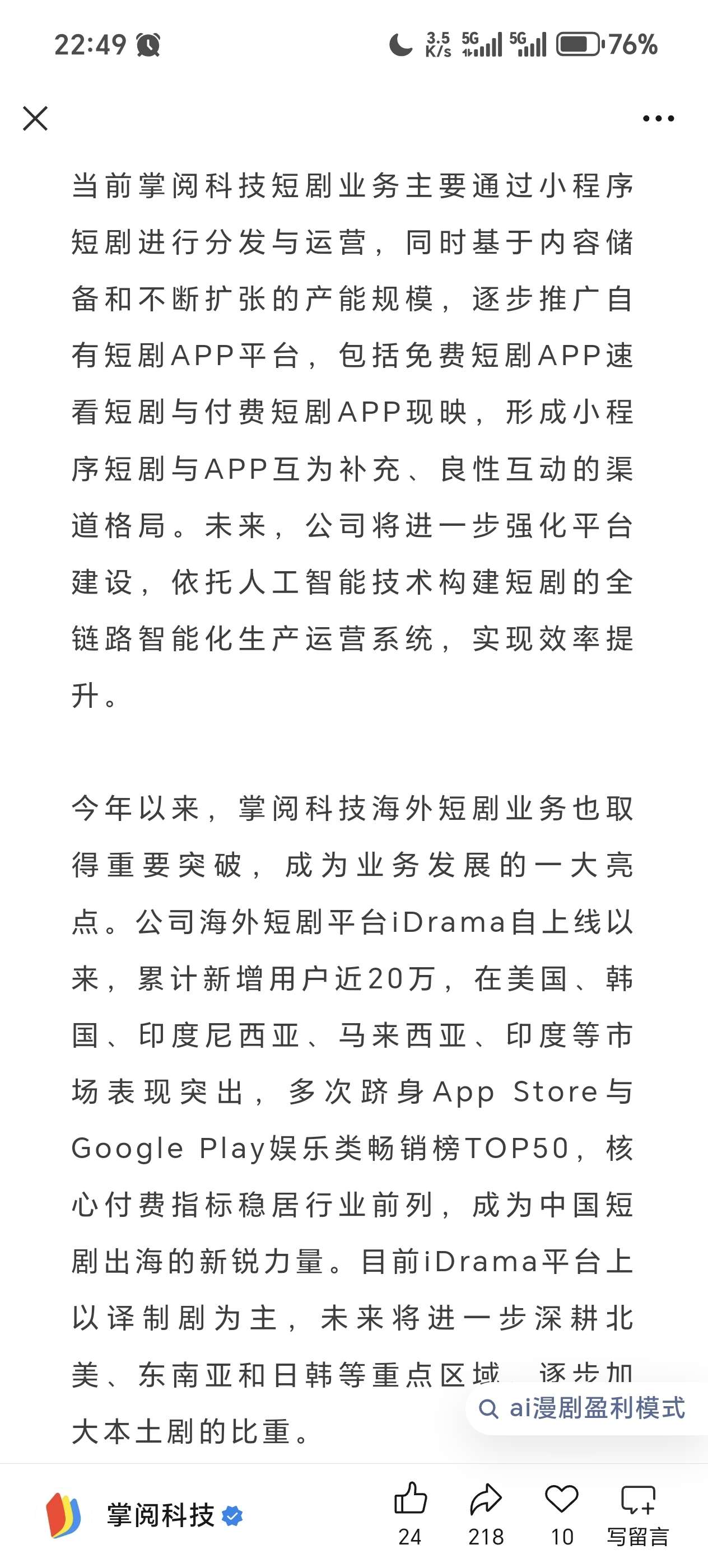 短剧已成掌阅第一大业务,加速拓展海外市场与AI短剧
