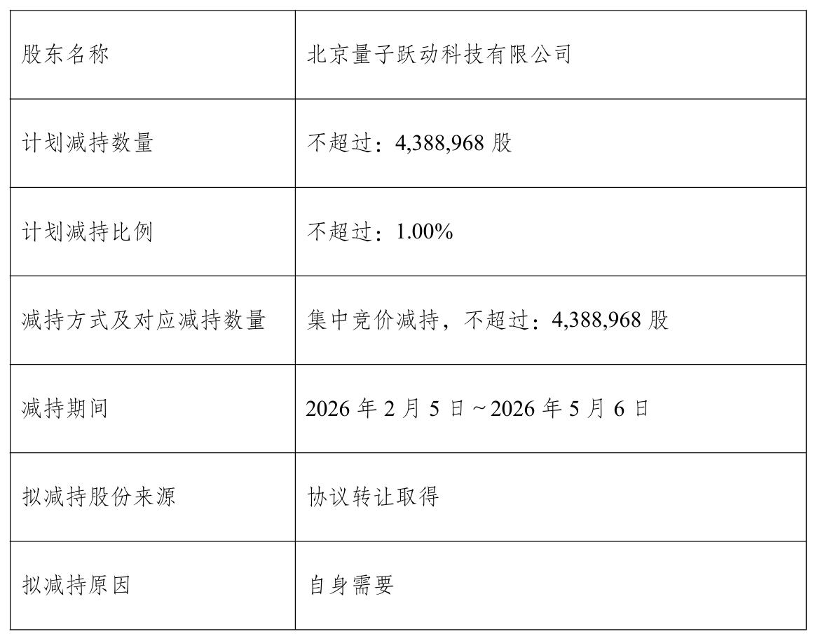 2025年11月4日至2025年11月4日,量子跃动通过集中竞价减持了公司110万股,减持比例为0.25%,减持总金额2389.39万元。