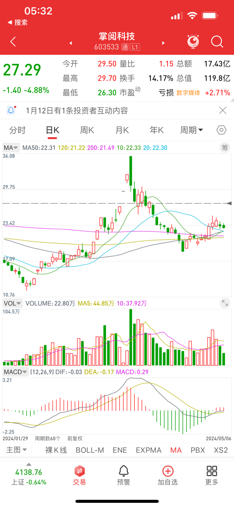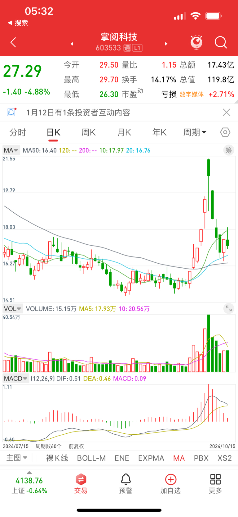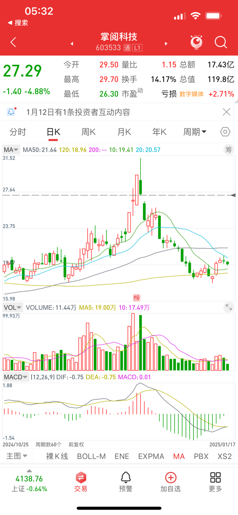 $掌阅科技(SH603533)$ 减持肯定不是什么利好消息,还有人在那美化减持,只是自我安慰。参考掌阅科技过往走势,都是拉高后连续杀跌!这次也要小心这种走势。