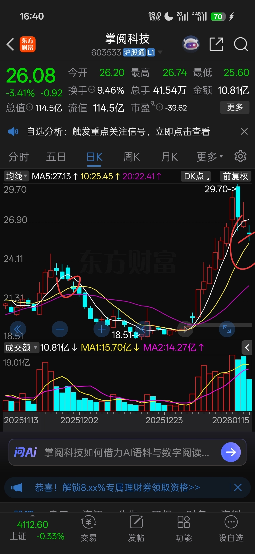 $掌阅科技(SH603533)$ 看看看,这两天真的很像,都是区间高位直接低开全天震荡,根据上一波的路子的话,可有的跌了