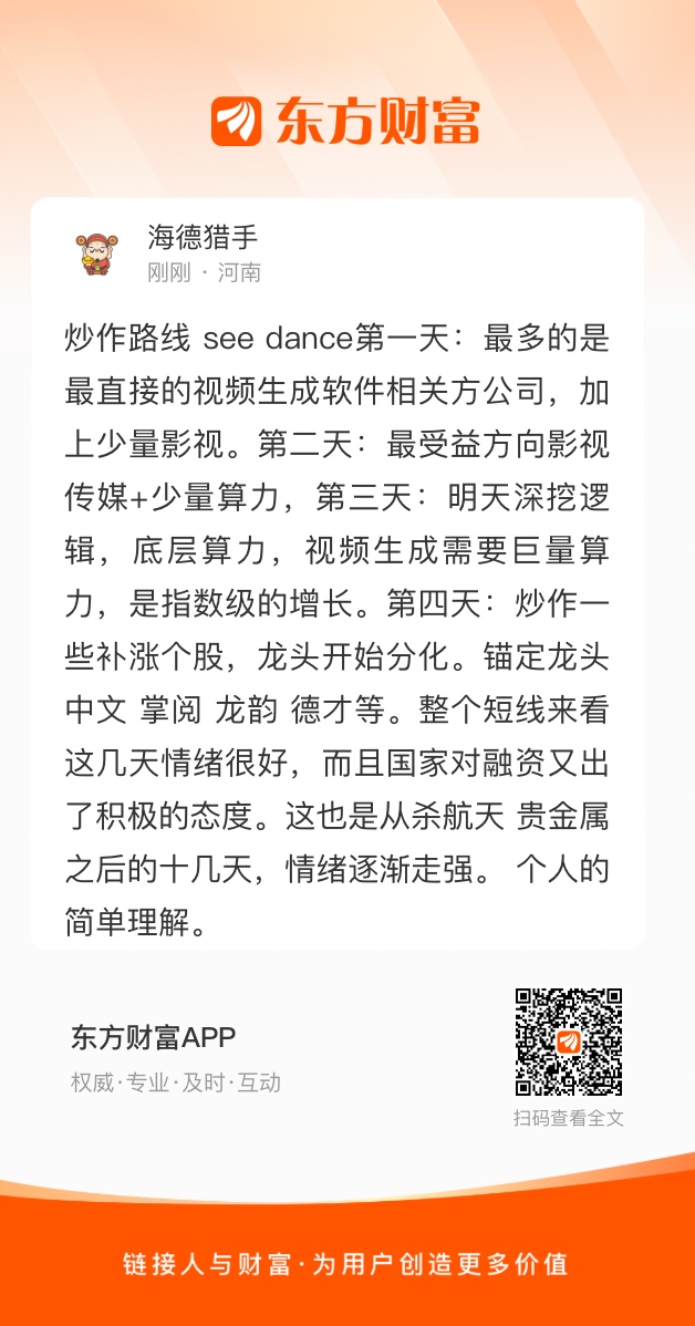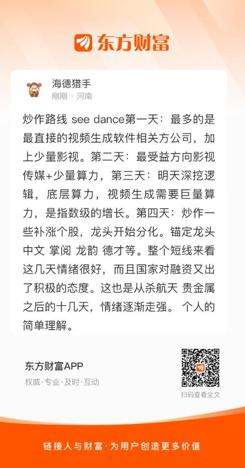 炒作路线 see dance第一天:最多的是最直接的视频生成软件相关方公司,加上少量影视。第二天:最受益方向影视传媒+少量算力,第三天:明天深挖逻辑,底层算力,视频生成需要巨量算力,是指数级的增长。第四天:炒作一些补涨个股,龙头开始分化。锚定龙头 中文 掌阅 龙韵 德才等。整个短线来看 这几天情绪很好,而且国家对融资又出了积极的态度。这也是从杀航天 贵金属之后的十几天,情绪逐渐走强。 个人的简单理解。
