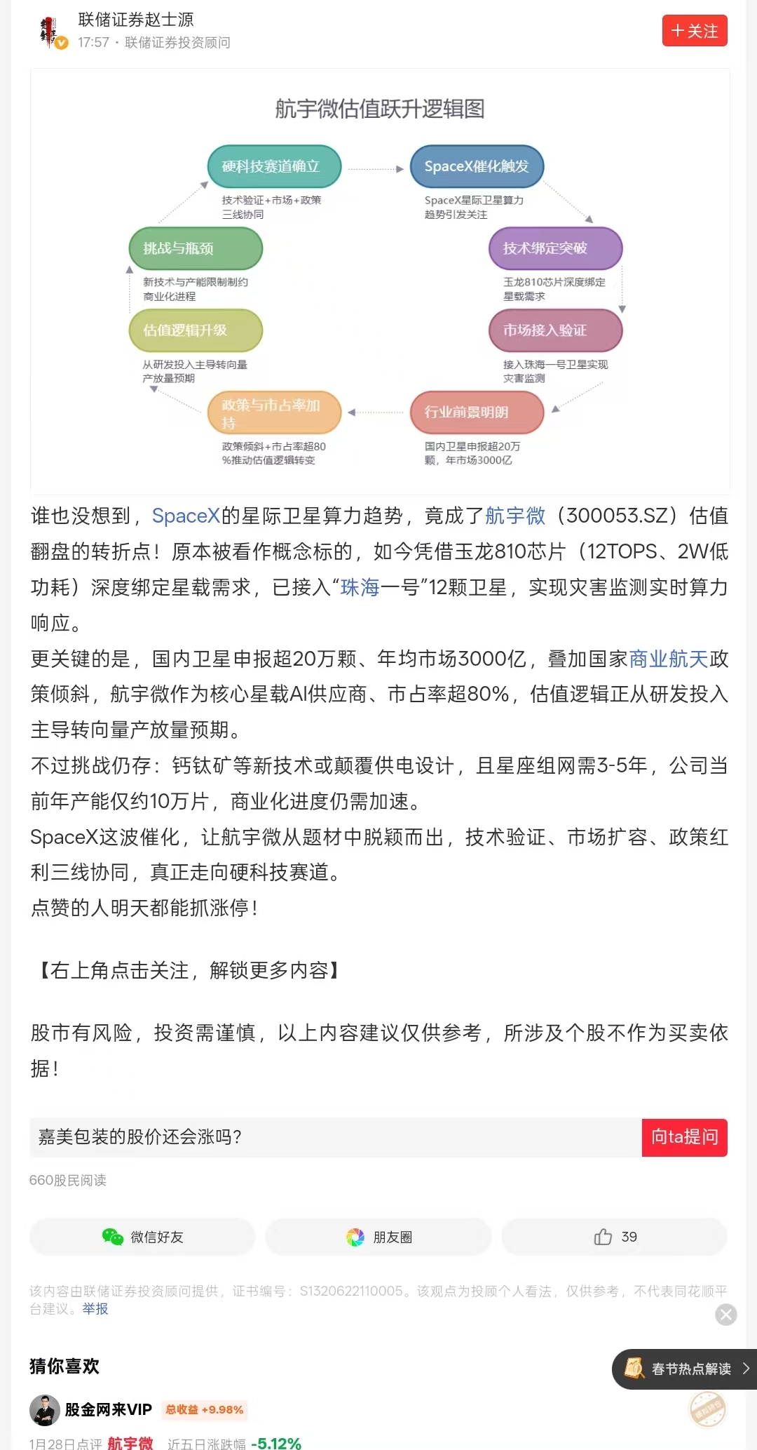 SpaceX这波催化,让航宇微从题材中脱颖而出,技术验证,市场扩容,政策红利三线协同,真正走向硬科技赛道。点赞的人明天都能抓涨停!SpaceX星际卫星算力趋势披露将显著提升航宇微(300053.SZ)的技术赛道估值逻辑。这一外部事件直接强化了航宇微在星载AI芯片领域的核心地位,通过技术协同、市场扩容及政策催化三重路径,推动其从“概念标的”转向“硬科技龙头”的估值重构12。1. 技术协同:SpaceX算力需求与航宇微芯片主业深度绑定